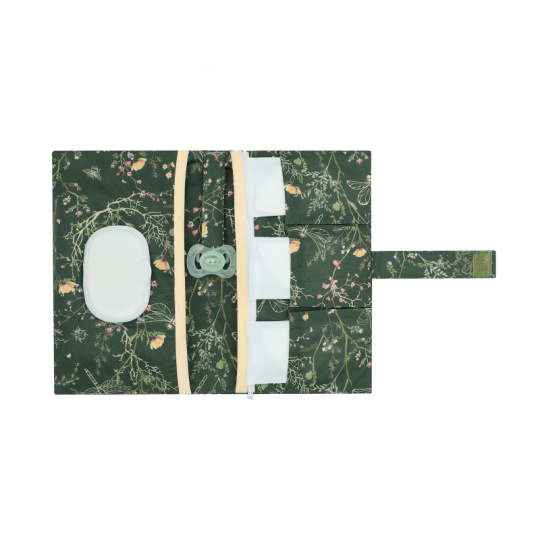 Praktický cestovní organizér v krásném textilním provedení s vnitřními přehrádkami vám pomůže přehledně uložit přebalovací potřeby pro vaše miminko. Uvnitř najdete kapsu na pleny, přihrádku na vlhčené ubrousky, kapsu na zip a 3 malé kapsy na drobnosti. Organizér se snadno zapíná na suchý zip. Složení: potah 100% bavlna, výplň 100% polyester Rozměry: 25 x 18 x 2 cm