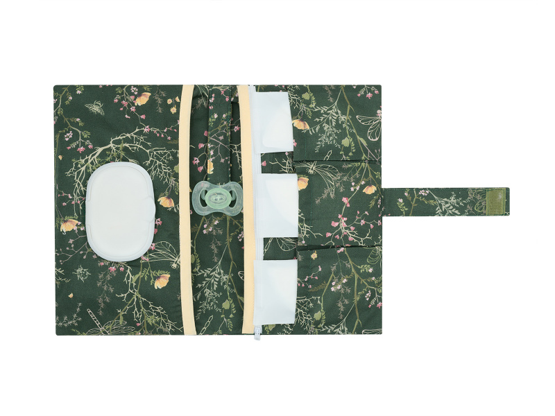 Praktický cestovní organizér v krásném textilním provedení s vnitřními přehrádkami vám pomůže přehledně uložit přebalovací potřeby pro vaše miminko. Uvnitř najdete kapsu na pleny, přihrádku na vlhčené ubrousky, kapsu na zip a 3 malé kapsy na drobnosti. Organizér se snadno zapíná na suchý zip. Složení: potah 100% bavlna, výplň 100% polyester Rozměry: 25 x 18 x 2 cm