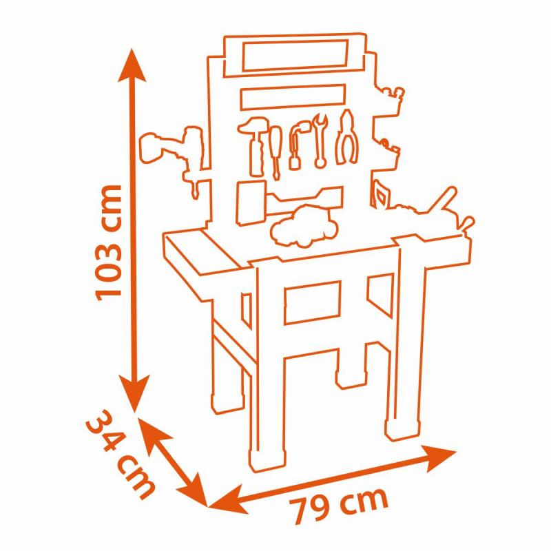 Pracovní dílna Black&Decker je vynikající pracovní hračka pro všechny šikovné děti a zejména chlapce od 3 let. Zahrnuje v sobě spoustu zábavných a maximálně zajímavých doplňků, díky čemuž je zárukou hodin plných zábavy a kutilství pro malé opraváře a kutily. V bohaté sadě 92 doplňků se nachází kladivo, šroubovák, kleště, klíč a pila, 20 šroubů, mechanická vrtačka a spousta dalších montážních dílů. Kromě oprav se děti mohou zabavit i skládáním oranžového autíčka. Na dílně pro kluky naleznete několik úložných prostorů a boxů pro drobné šrouby a jiné nezbytné nářadí pro opraváře. Pracovní stůl pro kluky je vyroben z jemného, ale pevného a kvalitního plastu, stojí na 4 pevných nohách.