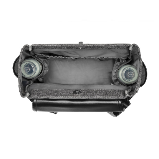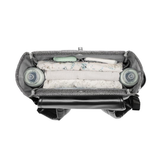 Přebalovací batoh z luxusního strukturovaného materiálu s detaily z umělé kůže umožňuje přehledné uložení všeho potřebného na procházky a výlety s vaším dítětem. Klipy umožňují zavěšení na madla kočárku. Magnetické uzavírání s otočným kovovým uzávěrem umožňují snadné otevření batohu jednou rukou. Uvnitř batohu najdete množství kapes a přihrádek i voděodolnou kapsu pro uložení vlhkých předmětů. Široký způsob otevírání batohu usnadňuje orientaci v uloženém obsahu. Na vnější straně najdete kapsy s uzavíráním na zip i kapsu pro uložení láhve. Termoizolační kapsy na láhve pomáhají udržet nápoje či mléko delší dobu v optimální teplotě. Součástí batohu je i přebalovací podložka. Batoh je možné zavěsit na kočárek, připevnit k rukojeti kufru, nosit na zádech i v ruce. Složení: 100% polyester Rozměry: 40 x 28 x 15 cm