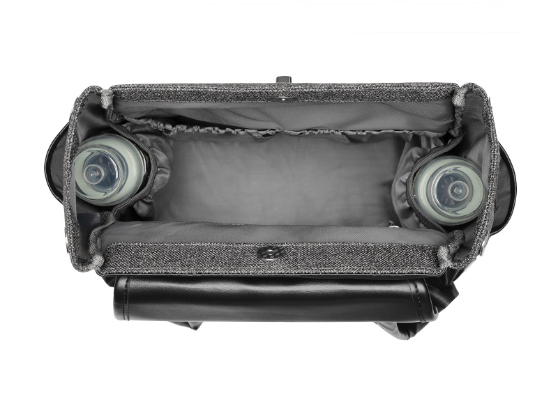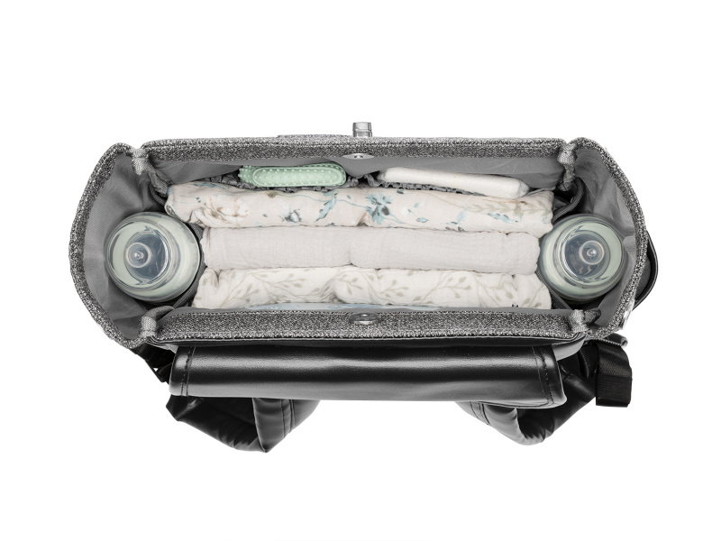 Přebalovací batoh z luxusního strukturovaného materiálu s detaily z umělé kůže umožňuje přehledné uložení všeho potřebného na procházky a výlety s vaším dítětem. Klipy umožňují zavěšení na madla kočárku. Magnetické uzavírání s otočným kovovým uzávěrem umožňují snadné otevření batohu jednou rukou. Uvnitř batohu najdete množství kapes a přihrádek i voděodolnou kapsu pro uložení vlhkých předmětů. Široký způsob otevírání batohu usnadňuje orientaci v uloženém obsahu. Na vnější straně najdete kapsy s uzavíráním na zip i kapsu pro uložení láhve. Termoizolační kapsy na láhve pomáhají udržet nápoje či mléko delší dobu v optimální teplotě. Součástí batohu je i přebalovací podložka. Batoh je možné zavěsit na kočárek, připevnit k rukojeti kufru, nosit na zádech i v ruce. Složení: 100% polyester Rozměry: 40 x 28 x 15 cm