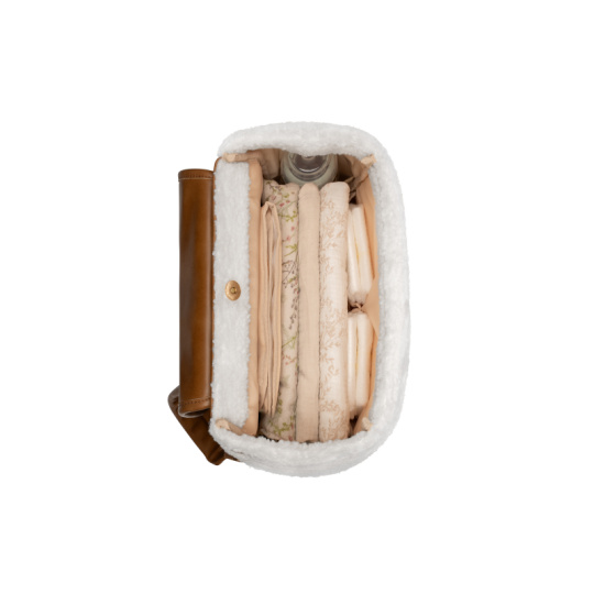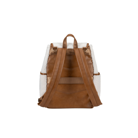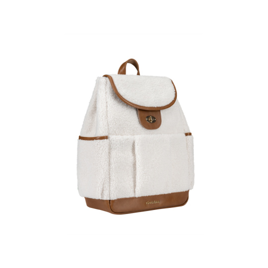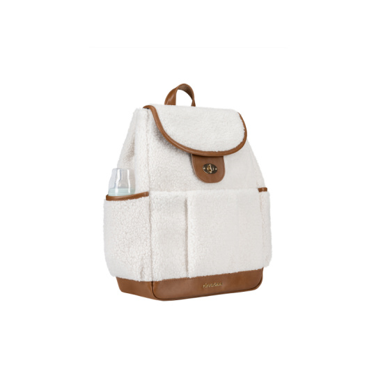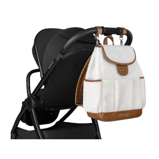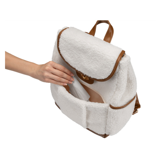 Přebalovací batoh z plyšového materiálu s detaily z umělé kůže umožňuje přehledné uložení všeho potřebného na procházky a výlety s vaším dítětem. Klipy umožňují zavěšení na madla kočárku. Magnetické uzavírání s otočným kovovým uzávěrem umožňují snadné otevření batohu jednou rukou. Uvnitř batohu najdete množství kapes a přihrádek i voděodolnou kapsu pro uložení vlhkých předmětů. Široký způsob otevírání batohu usnadňuje orientaci v uloženém obsahu. Na vnější straně najdete kapsy s uzavíráním na zip i kapsu pro uložení láhve. Termoizolační kapsy na láhve pomáhají udržet nápoje či mléko delší dobu v optimální teplotě. Součástí batohu je i přebalovací podložka. Batoh je možné zavěsit na kočárek, připevnit k rukojeti kufru, nosit na zádech i v ruce. Složení: 100% polyester Rozměry: 40 x 28 x 15 cm