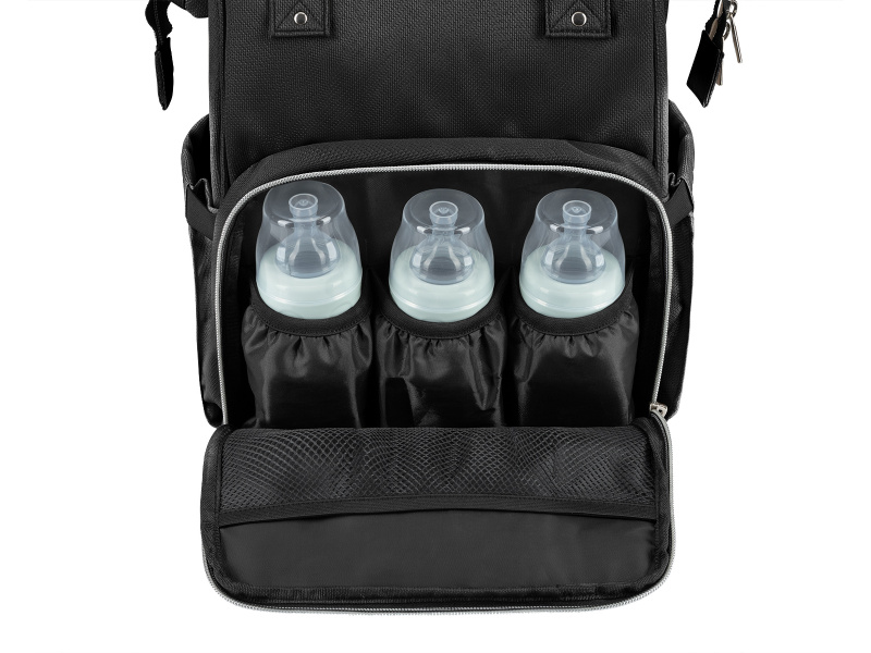 Stylový přebalovací batoh umožňuje přehledné uložení všeho potřebného na procházky a výlety s vaším dítětem. Klipy umožňují zavěšení na madla kočárku. Uvnitř batohu najdete množství kapes a přihrádek i voděodolnou kapsu pro uložení vlhkých předmětů. Široký způsob otevírání batohu usnadňuje orientaci v uloženém obsahu. Na vnější straně najdete kapsy s uzavíráním na zip i kapsu pro uložení láhve. Termoizolační kapsy na láhve pomáhají udržet nápoje či mléko delší dobu v optimální teplotě. Součástí batohu je i přebalovací podložka. Batoh je možné zavěsit na kočárek, nosit na zádech i v ruce. Složení: 100% polyester Rozměry: 44,5 x 35,5 x 47 cm