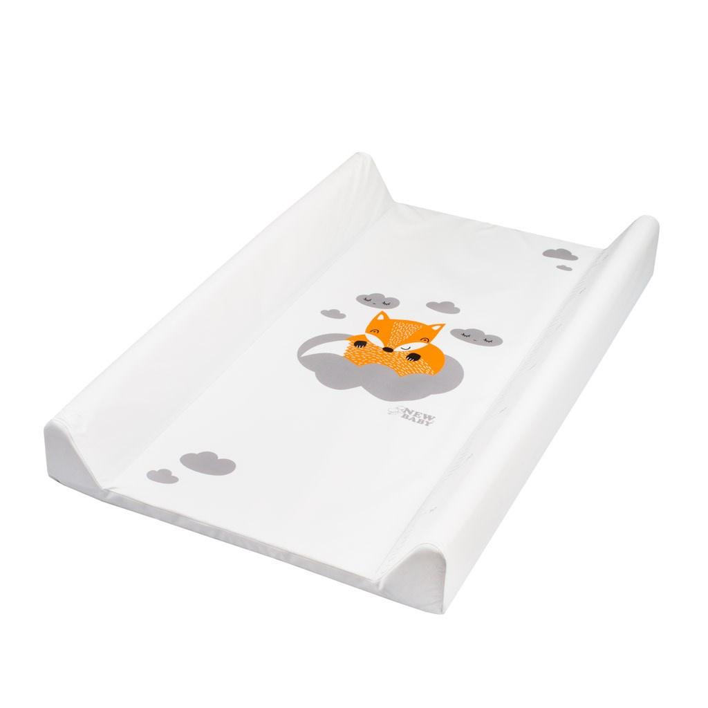 Praktický tvarovaný přebalovací nástavec s moderním dizajnem New Baby Liška z nepromokavého, plastového materiálu s obrázkem lišky a obláčků. Produkt české značky. Nástavec je vyplněn polyesterem a má vyvýšené boční strany. Nástavec má spodní tvrdou desku, lze ho přišroubovat na postýlku nebo umístit na přebalovací stojan. Je vyroben z nejkvalitnější certifikované fólie, která neobsahuje žádné škodlivé látky a je citlivá k nejjemnější dětské pokožce. Rozměr: cca 50x80 cm, tloušťka cca 2,5 cm, výška hran 8,5 cm.