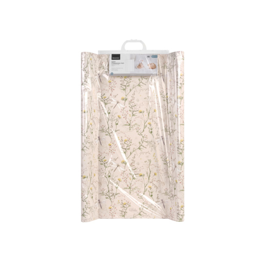 Měkká přebalovací podložka s krásným květinovým potiskem zajistí dítěti pohodlí během přebalování. Vyvýšené boční okraje pomáhají udržet dítě během přebalování bezpečně na přebalovacím pultu. Podložka je určena pro použití na pevném rovném podkladu. Voděodolný povrch snadno očistíte otřením nebo omytím. Rozměry: 70 x 50 x 10 cm Hmotnost: 0,55 kg Složení: potah 100% PVC, výplň 67% polyester, 33% polyuretan Vyrobeno z bezpečných materiálů v souladu s normou EN 71-1. Vhodné pro děti od narození do 12 měsíců (do 11 kg).