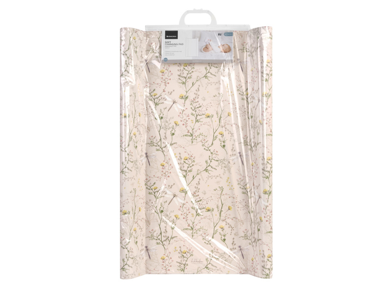 Měkká přebalovací podložka s krásným květinovým potiskem zajistí dítěti pohodlí během přebalování. Vyvýšené boční okraje pomáhají udržet dítě během přebalování bezpečně na přebalovacím pultu. Podložka je určena pro použití na pevném rovném podkladu. Voděodolný povrch snadno očistíte otřením nebo omytím. Rozměry: 70 x 50 x 10 cm Hmotnost: 0,55 kg Složení: potah 100% PVC, výplň 67% polyester, 33% polyuretan Vyrobeno z bezpečných materiálů v souladu s normou EN 71-1. Vhodné pro děti od narození do 12 měsíců (do 11 kg).