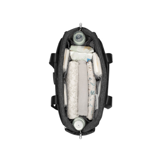 Stylová přebalovací taška umožňuje přehledné uložení všeho potřebného na procházky a výlety s vaším dítětem. Klipy umožňují zavěšení na madla kočárku.  Uvnitř tašky najdete přebalovací podložku, množství kapes a přihrádek, voděodolnou kapsu pro uložení vlhkých předmětů a dvě termoizolační kapsy pro láhve. Na vnější straně najdete kapsu na zip i prostor pro uložení láhve. Držadla z měkké umělé kůže umožňují pohodlné nošení v ruce, součástí tašky je i ramenní popruh pro nošení přes rameno. Složení: 100% polyester Rozměry: 44 x 28 x 16 cm