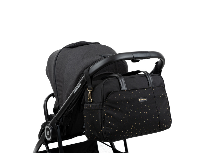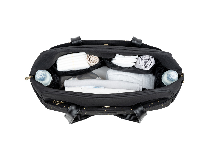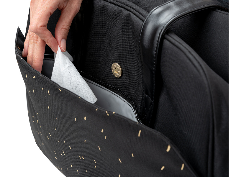 Stylová přebalovací taška umožňuje přehledné uložení všeho potřebného na procházky a výlety s vaším dítětem. Klipy umožňují zavěšení na madla kočárku. Uvnitř tašky najdete přebalovací podložku, množství kapes a přihrádek, voděodolnou kapsu pro uložení vlhkých předmětů a dvě termoizolační kapsy pro láhve. Na vnější straně najdete kapsu na zip i prostor pro uložení láhve. Držadla z měkké umělé kůže umožňují pohodlné nošení v ruce, součástí tašky je i ramenní popruh pro nošení přes rameno. Složení: 100% polyester Rozměry: 44 x 28 x 16 cm