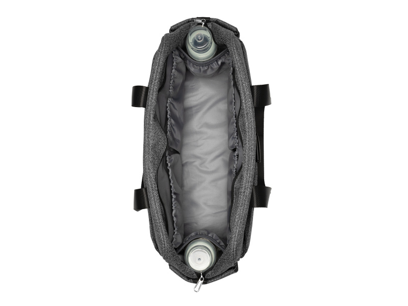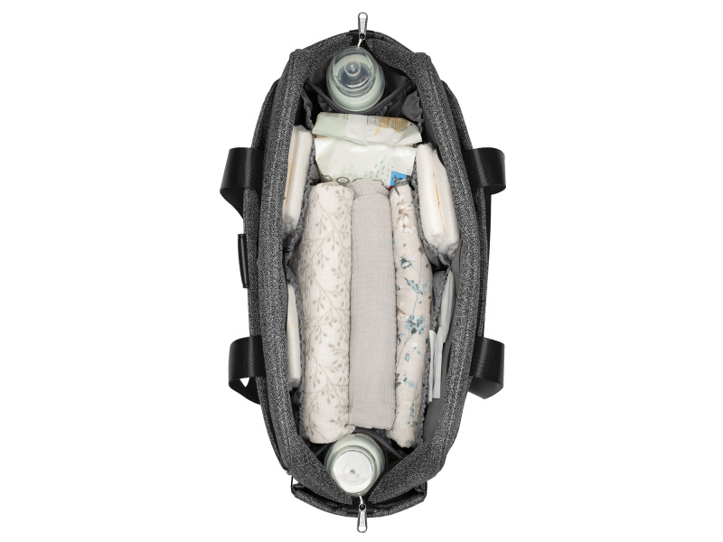 Stylová přebalovací taška umožňuje přehledné uložení všeho potřebného na procházky a výlety s vaším dítětem. Klipy umožňují zavěšení na madla kočárku. Uvnitř tašky najdete přebalovací podložku, množství kapes a přihrádek, voděodolnou kapsu pro uložení vlhkých předmětů a dvě termoizolační kapsy pro láhve. Na vnější straně najdete kapsu na zip i prostor pro uložení láhve. Držadla z měkké umělé kůže umožňují pohodlné nošení v ruce, součástí tašky je i ramenní popruh pro nošení přes rameno. Složení: 100% polyester Rozměry: 44 x 28 x 16 cm