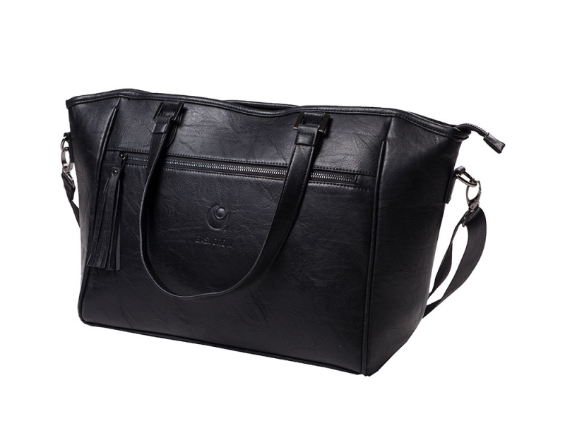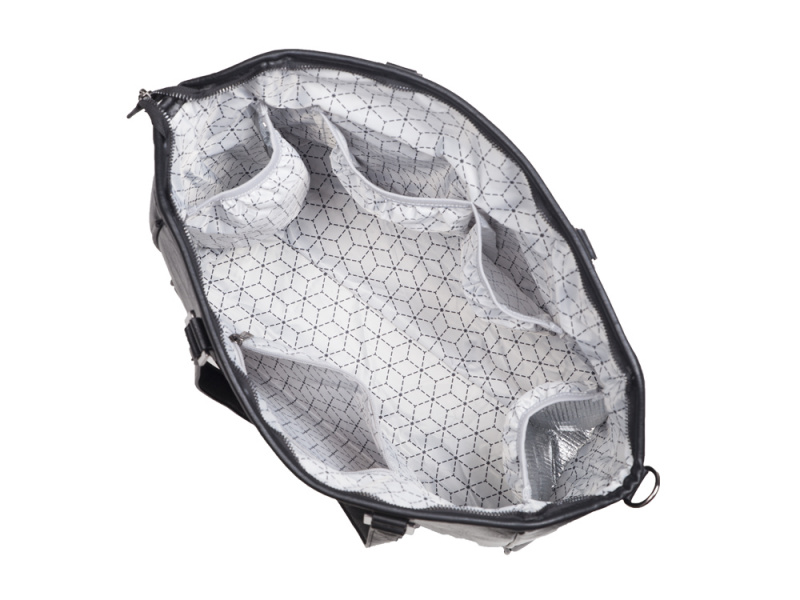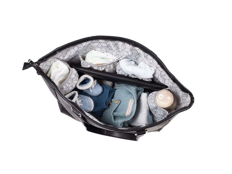 Stylová přebalovací taška z umělé kůže nabízí dobře organizovaný a přístupný prostor pro přehledné uložení všeho potřebného na procházky i výlety s miminkem.