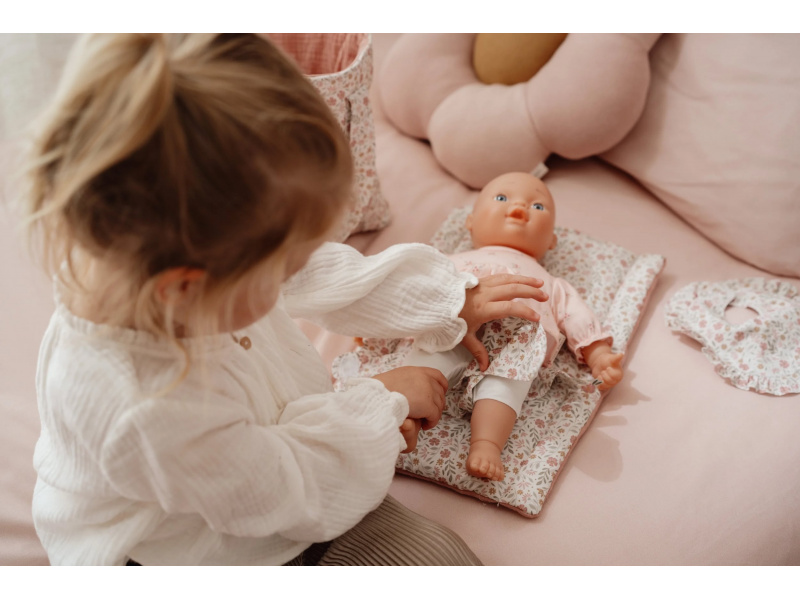 Stylová přebalovací taška Little Dutch je ideálním doplňkem při hraní s panenkami i plyšáky. Díky svému praktickému provedení nabídne dětem vše potřebné k péči o jejich oblíbenou panenku nebo plyšového kamaráda. Uvnitř tašky se nachází měkká látková plenka, pohodlná přebalovací podložka a roztomilý bryndáček. Lehká taška je uzpůsobena pro malé dětské ruce, takže ji děti snadno přenesou kamkoli. Kompletní sada pro péči o panenky (plenka, podložka, bryndáček) Lehká a snadno přenosná taška ideální na cesty i do školky Podporuje hru na role a rozvoj fantazie Stylový květinový design krásně ladí s dalšími doplňky pro panenky z kolekce Little Dutch Soft Flowers. Rozměry: 32 × 28 × 3 cm Vhodné pro děti od 3 let.