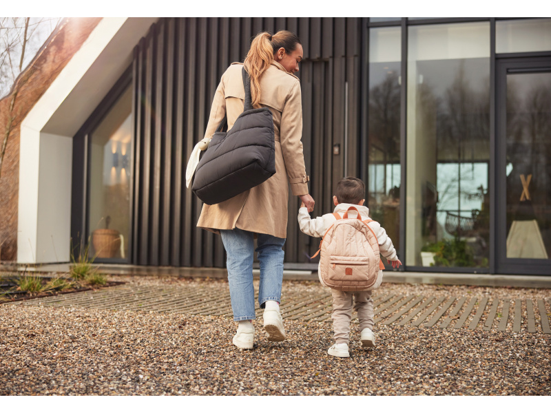 Přebalovací taška z příjemného prošívaného materiálu s výplní a s originální puntíkovanou podšívkou nabízí množství vnitřních i vnějších kapes pro přehledné uspořádání všeho potřebného na procházkách a výletech s vaším dítětem. Součástí tašky je i praktická přebalovací podložka. Ramenní popruh i držadla umožňují nošení přes rameno, v ruce i zavěšení na rukojeť kočárku. Taška se uzavírá na zip. Složení: 100% polyester Rozměry: 42 x 30 x 13 cm