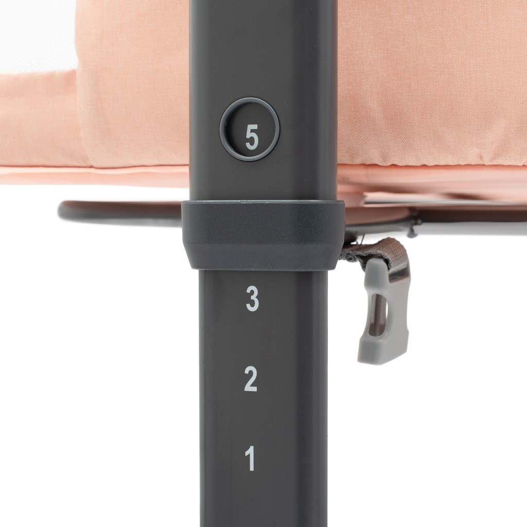 Postýlka je vybavena tichými kolčkami s brzdou, které umožňují snadné přemísťování, zatímco montáž bez použití nářadí zaručuje rychlé a jednoduché složení. Pohodlná matrace do postýlky je součástí balení. Postýlka Rose má pevný a bezpečný ocelový rám. Polyester 300D, ze kterého je postýlka vyrobena je odolný a lehký.