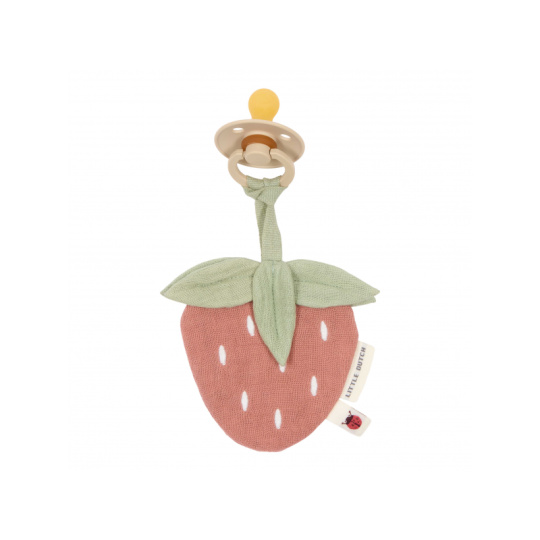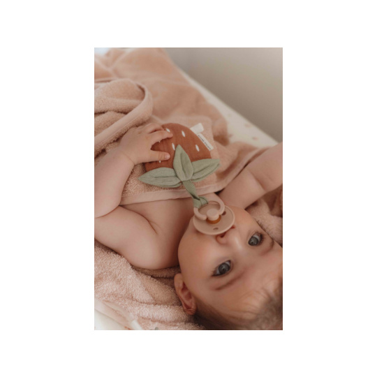 Přívěsek z jemného mušelínu v podobě jahůdky s úchytem pro šidítko láká dítě ke hraní i zkoumání a rodičům pomůže rychle najít šidítko v postýlce či kočárku. Hračka je součástí designové kolekce hraček a doplňků Little Dutch Fairy Garden inspirované životem na zahradě. Rozměry: 10 x 10 cm Vhodné pro děti od narození.