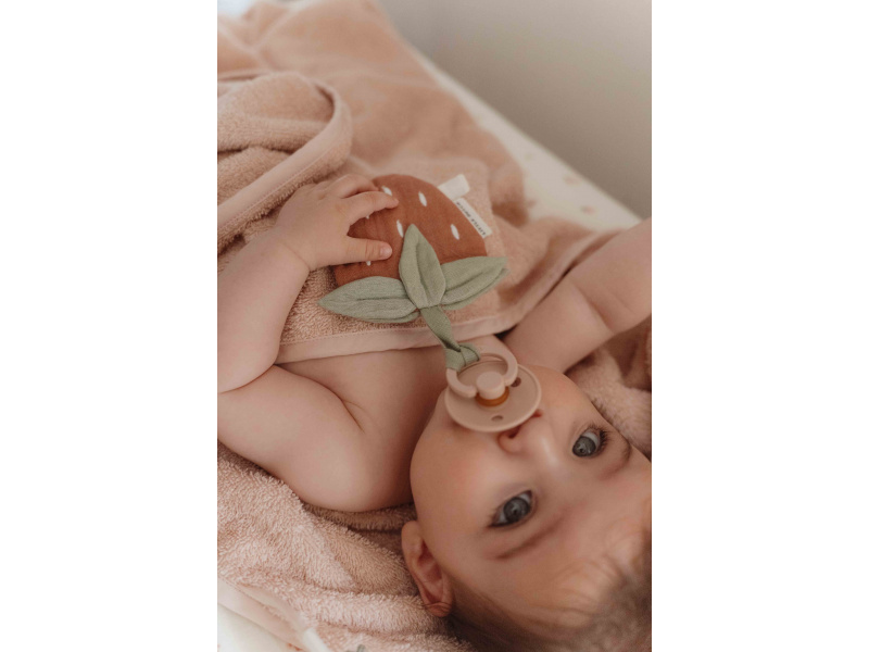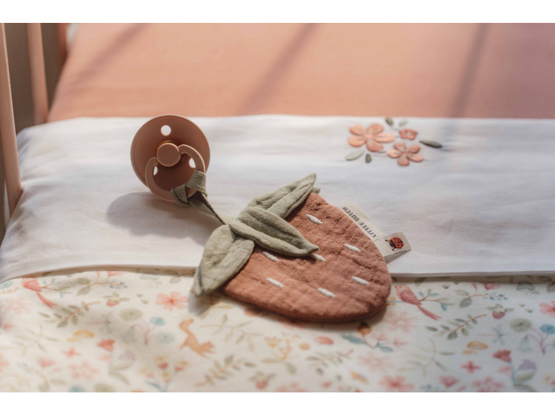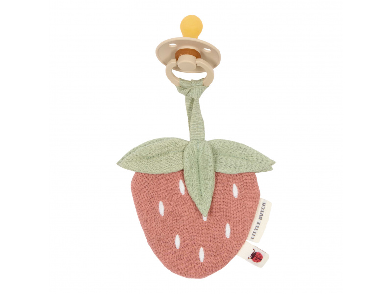 Přívěsek z jemného mušelínu v podobě jahůdky s úchytem pro šidítko láká dítě ke hraní i zkoumání a rodičům pomůže rychle najít šidítko v postýlce či kočárku. Hračka je součástí designové kolekce hraček a doplňků Little Dutch Fairy Garden inspirované životem na zahradě. Rozměry: 10 x 10 cm Vhodné pro děti od narození.