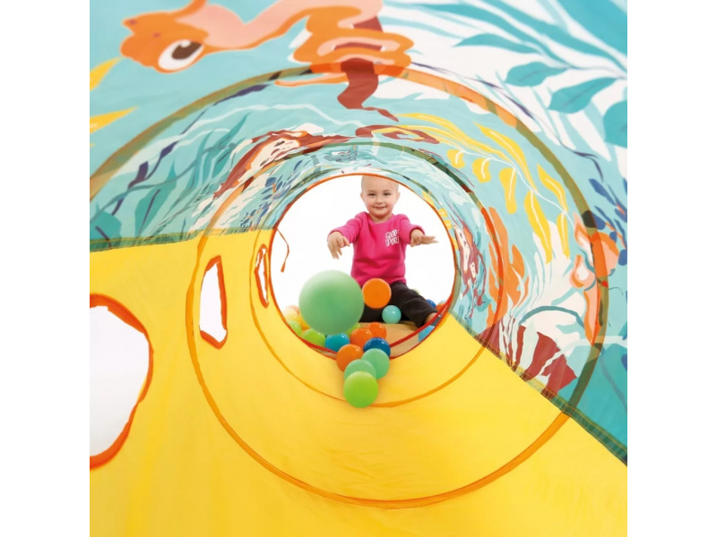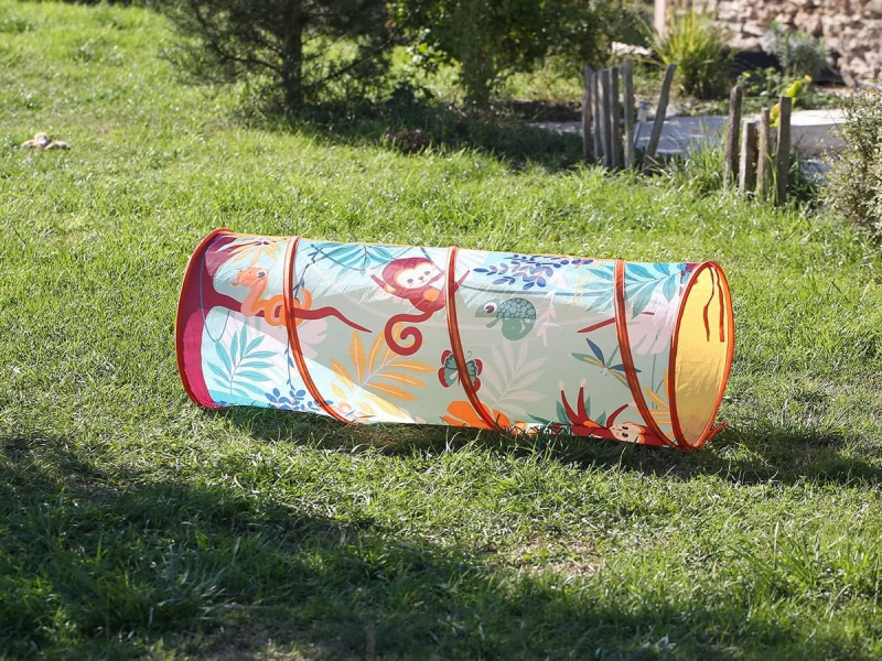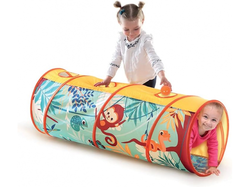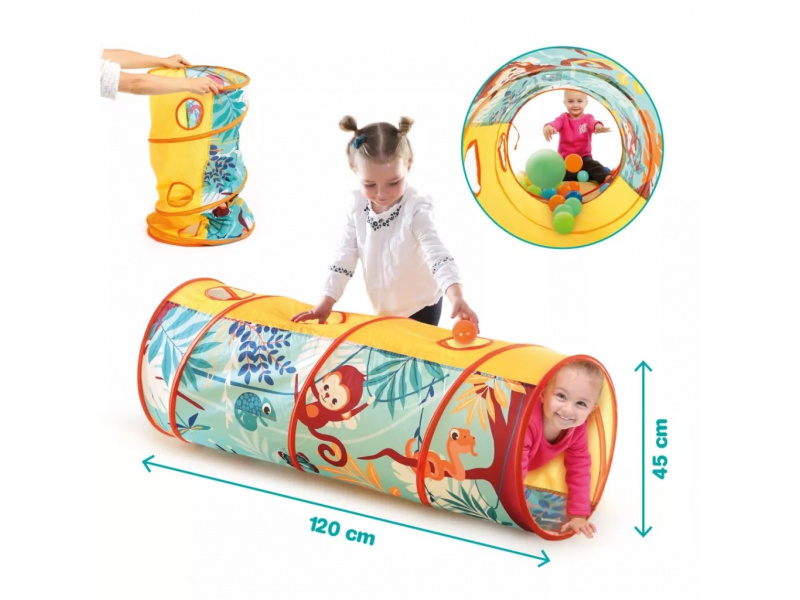 Hrací tunel s krásným potiskem zvířátek z džungle je vhodný pro hraní doma i venku. Pro větší zábavu má tunel 3 otvory, kterými se např. mohou dovnitř vhazovat míčky. Tunel se snadno skládá i rozkládá. Když jej nepoužíváte, jednoduše jej složíte do plochého tvaru do tašky, ve které je dodáván. Prolézací tunel poskytuje bezpečné prostředí pro cvičení a zkoumání, je skvělý pro rozvoj hrubé motoriky i jednotlivých smyslů vašeho batolete. Složení: 100% polyester Rozměry: 120 x 45 cm Vhodné pro děti od 2 let.