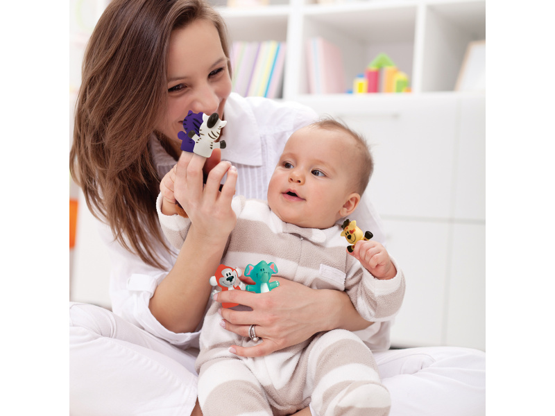 Sada originálních prstových maňásků nabízí skvělý způsob, jak si užít vyjímečné chvíle s vaším dítětem, jako je čas koupání nebo povídání před spaním. Vymýšlejte si spolu příběhy o pěti zvířecích kamarádech a rozvíjejte tak zábavným způsobem představivost a slovní zásobu dítěte. Nejdříve se naučí poznávat barvy a jména zvířat, ve starším věku už si maňásky nasadí na vlastní prsty a bude vymýšlet vlastní příběhy. Balení obsahuje 5 prstových maňásků. Rozměry maňáska: 5 x 5 x 2,5 cm. Složení: PVC bez obsahu ftalátů Vhodné pro děti od 10 měsíců.