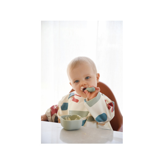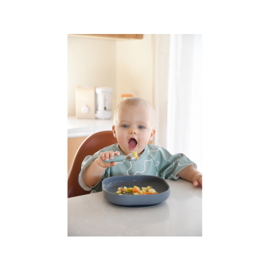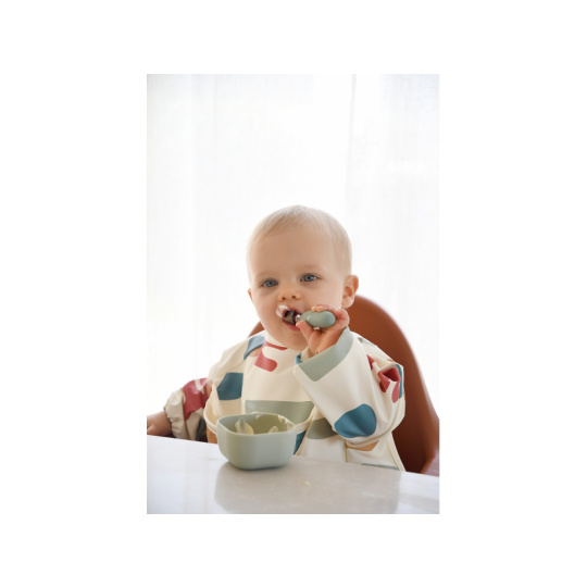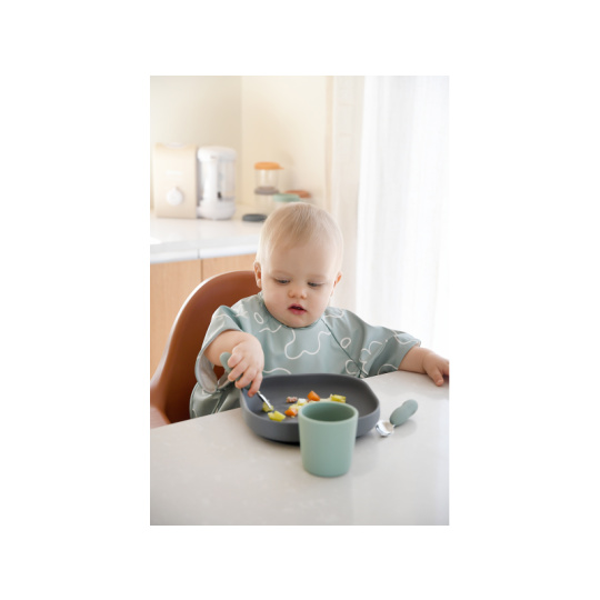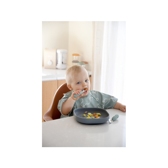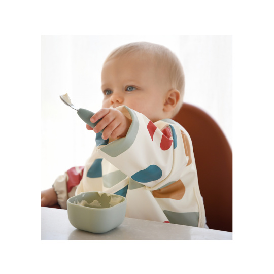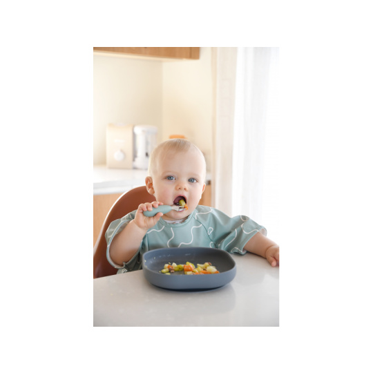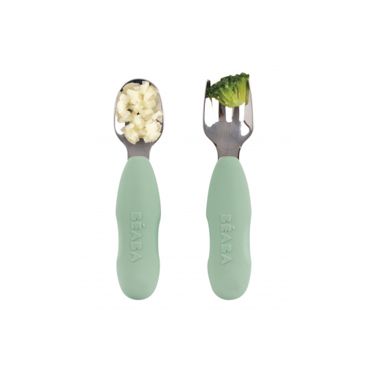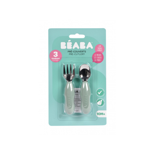 První příbor z kvalitní nerezové oceli s plastovou rukojetí usnadní dítěti přechod od krmení lžičkou k používání příboru. Nerezová vidlička a lžička jsou lehké a díky ergonomickému plastovému držadlu snadno uchopitelné dětskýma rukama. Mělká lžička je ideální pro nabrání malého množství příkrmu, které dítě dokáže donést až do úst. Zakulacené hroty vidličky jsou zárukou bezpečného používání. Možno mýt v myčce. Vhodné pro děti od 10 měsíců.