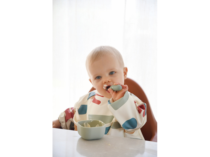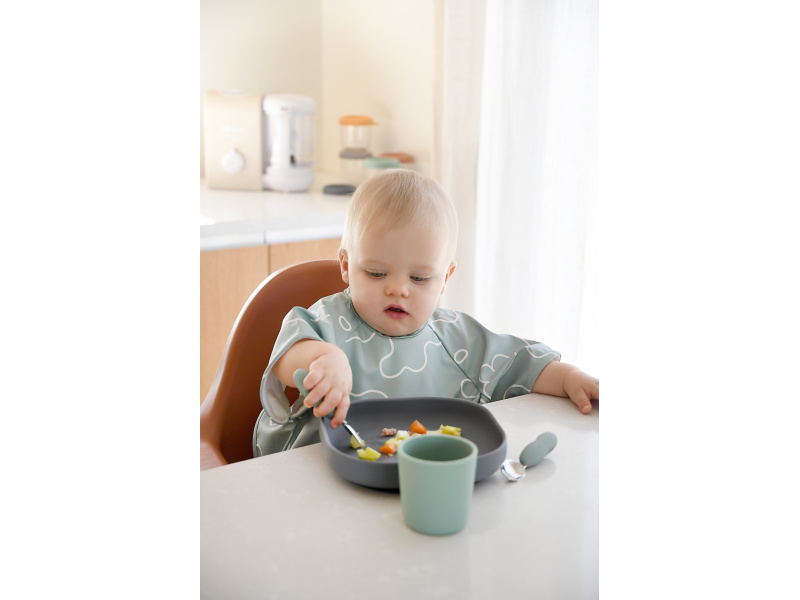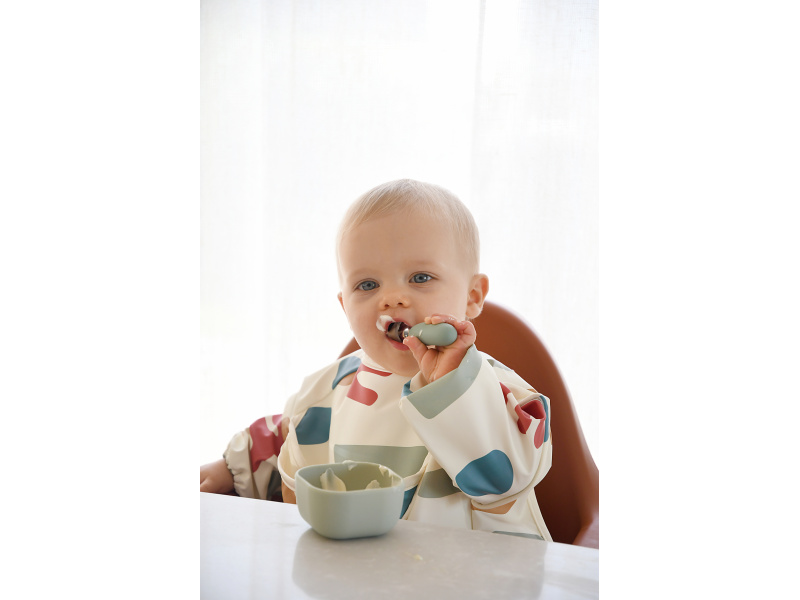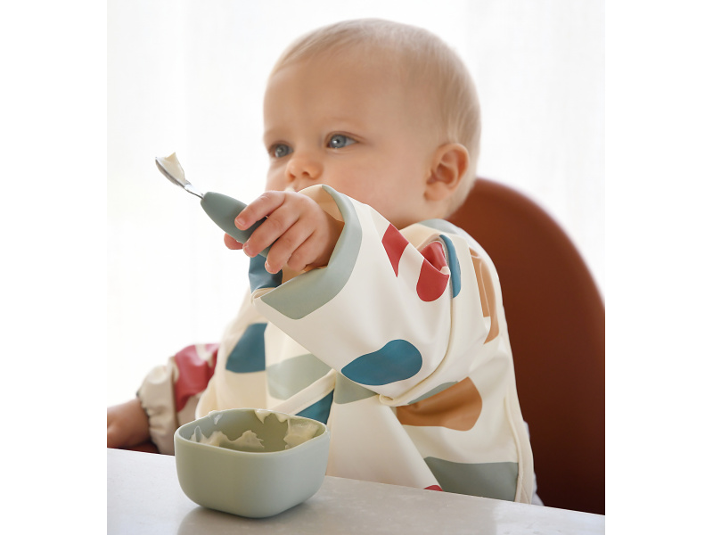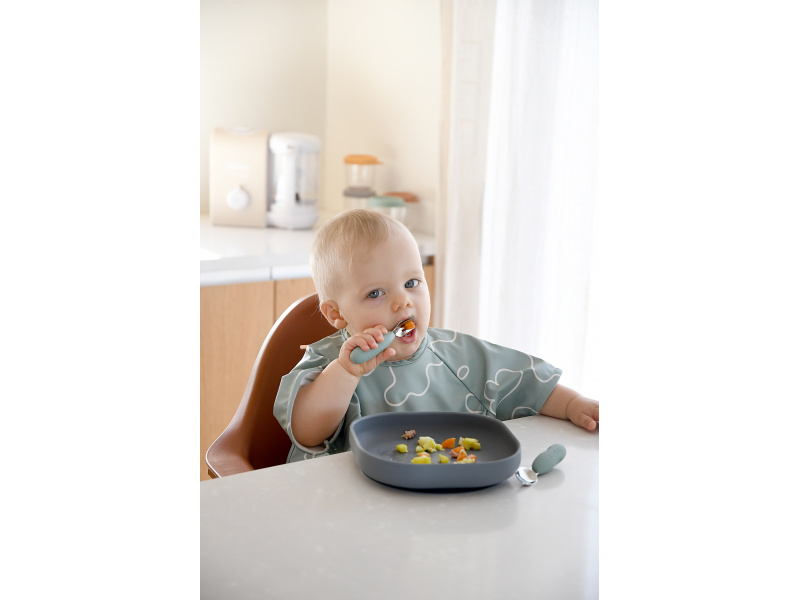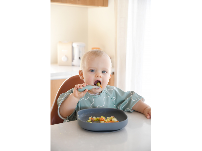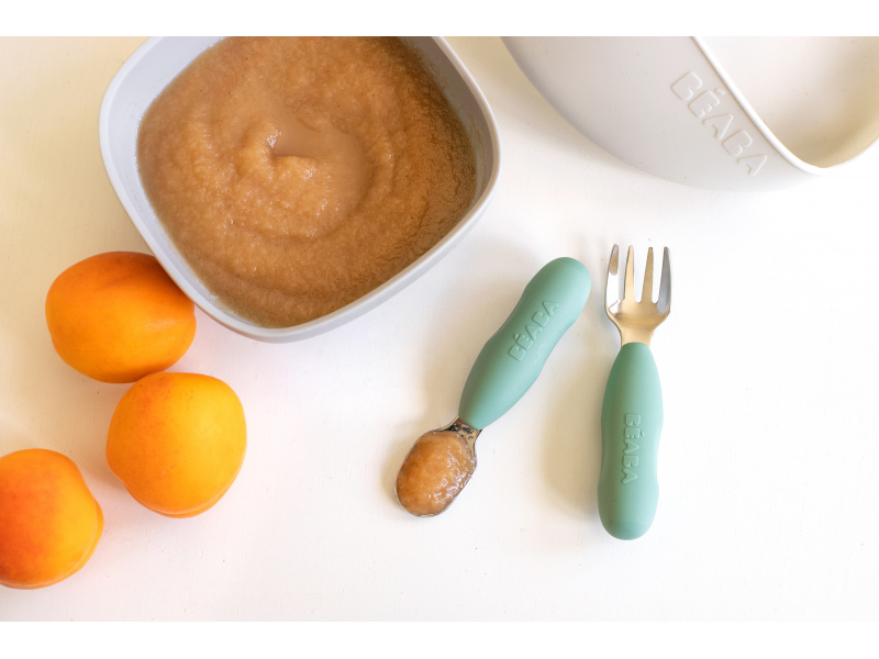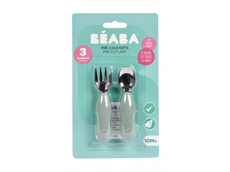 První příbor z kvalitní nerezové oceli s plastovou rukojetí usnadní dítěti přechod od krmení lžičkou k používání příboru. Nerezová vidlička a lžička jsou lehké a díky ergonomickému plastovému držadlu snadno uchopitelné dětskýma rukama. Mělká lžička je ideální pro nabrání malého množství příkrmu, které dítě dokáže donést až do úst. Zakulacené hroty vidličky jsou zárukou bezpečného používání. Možno mýt v myčce. Vhodné pro děti od 10 měsíců.