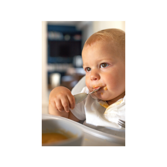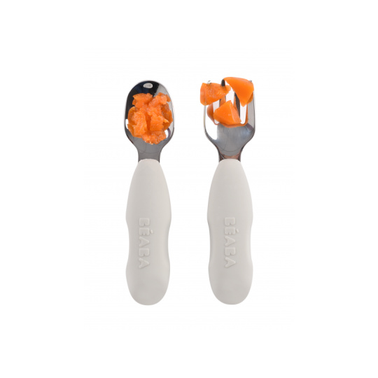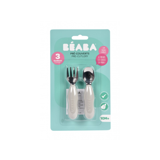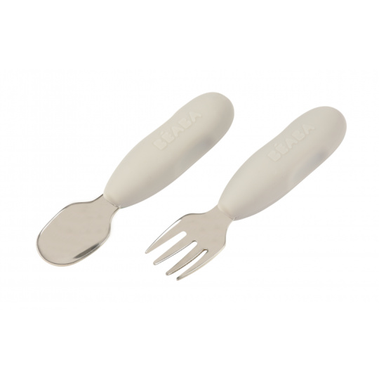 První příbor z kvalitní nerezové oceli s plastovou rukojetí usnadní dítěti přechod od krmení lžičkou k používání příboru. Nerezová vidlička a lžička jsou lehké a díky ergonomickému plastovému držadlu snadno uchopitelné dětskýma rukama. Mělká lžička je ideální pro nabrání malého množství příkrmu, které dítě dokáže donést až do úst. Zakulacené hroty vidličky jsou zárukou bezpečného používání. Možno mýt v myčce. Vhodné pro děti od 10 měsíců.