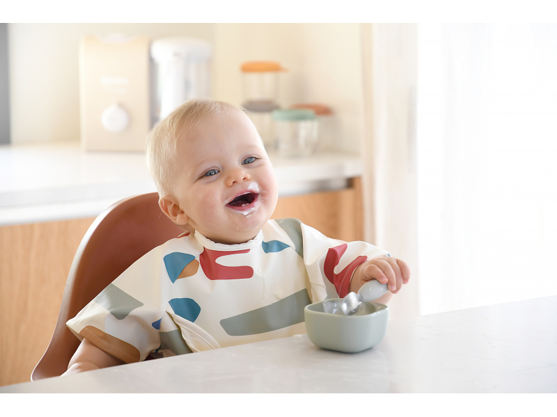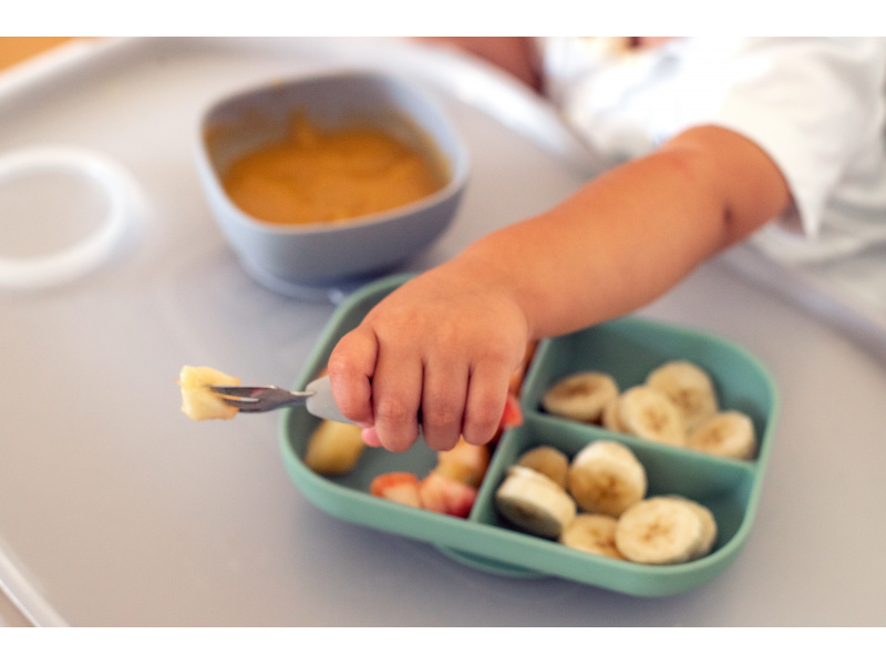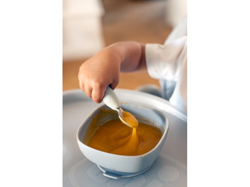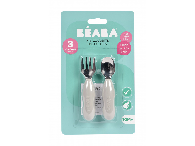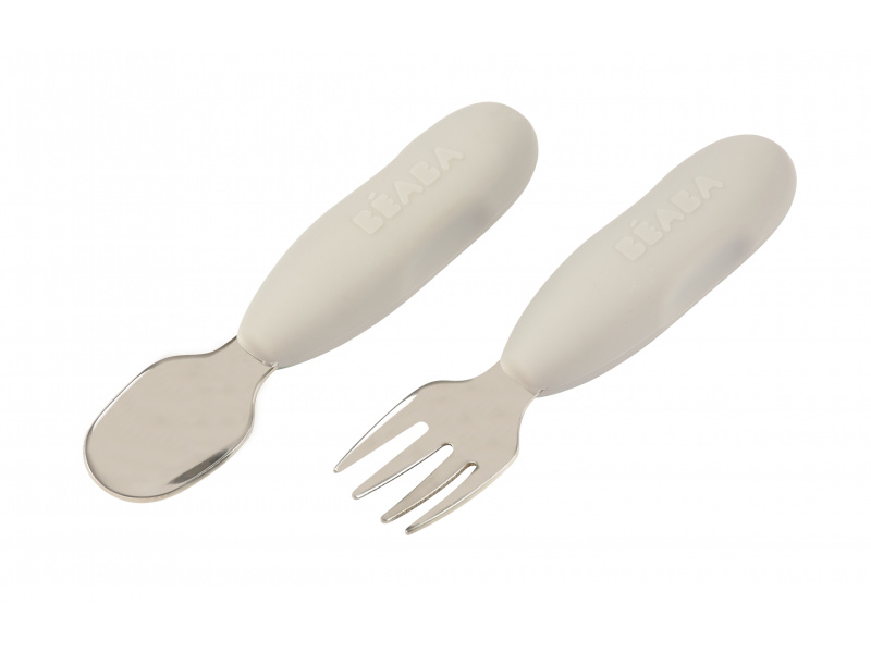 První příbor z kvalitní nerezové oceli s plastovou rukojetí usnadní dítěti přechod od krmení lžičkou k používání příboru. Nerezová vidlička a lžička jsou lehké a díky ergonomickému plastovému držadlu snadno uchopitelné dětskýma rukama. Mělká lžička je ideální pro nabrání malého množství příkrmu, které dítě dokáže donést až do úst. Zakulacené hroty vidličky jsou zárukou bezpečného používání. Možno mýt v myčce. Vhodné pro děti od 10 měsíců.