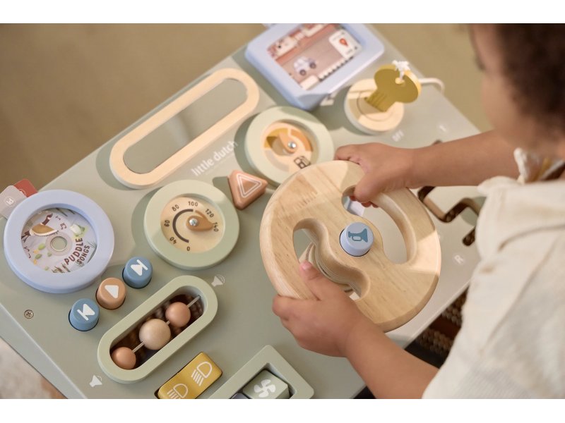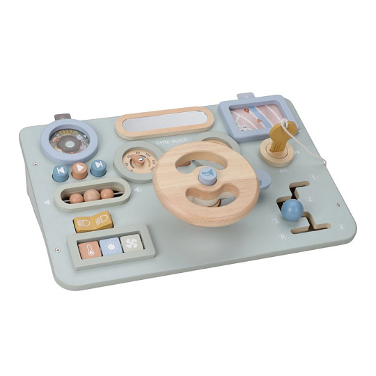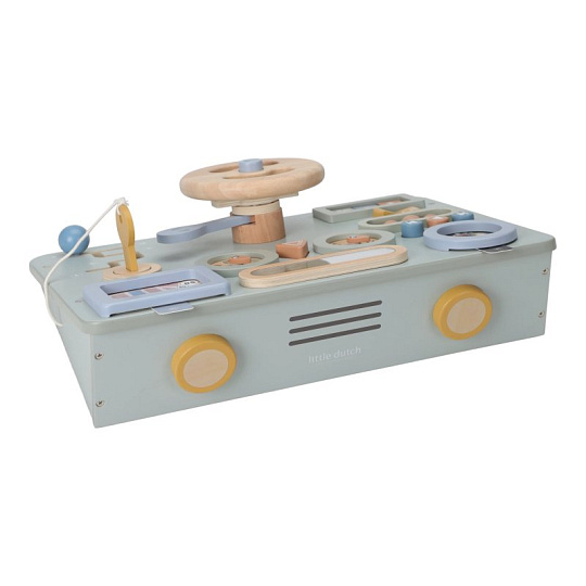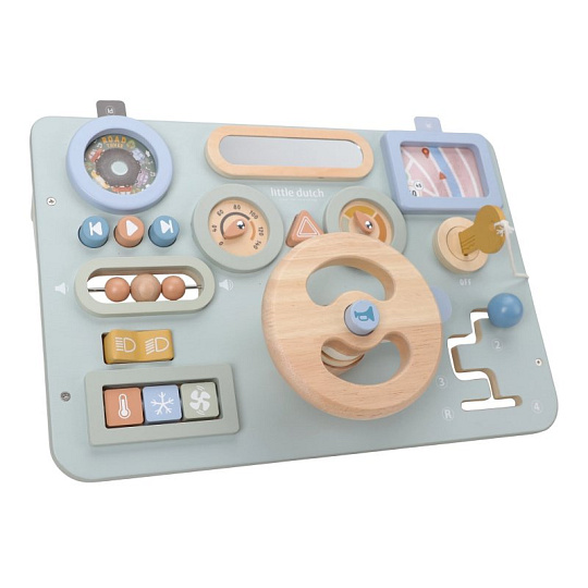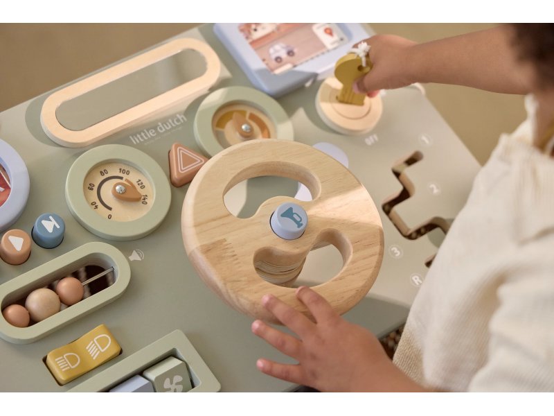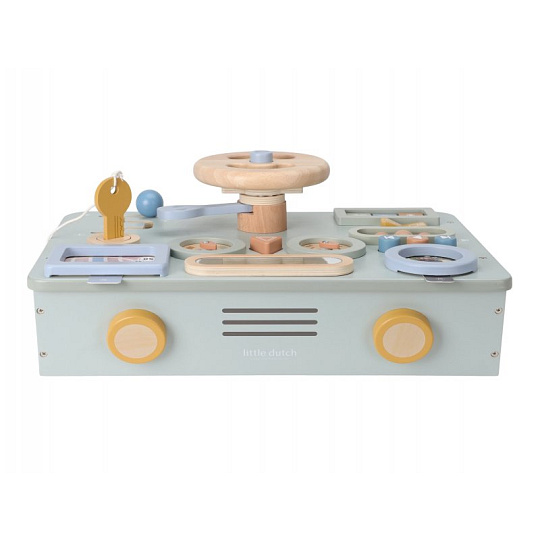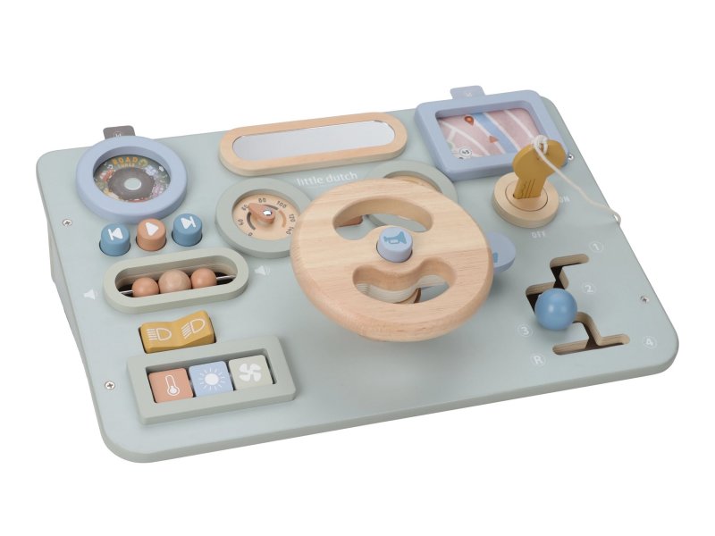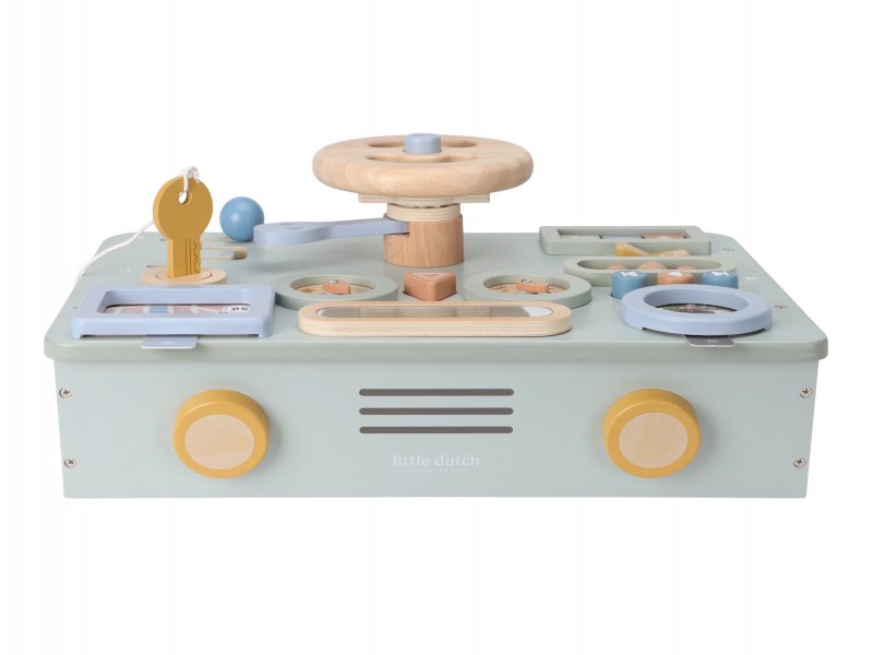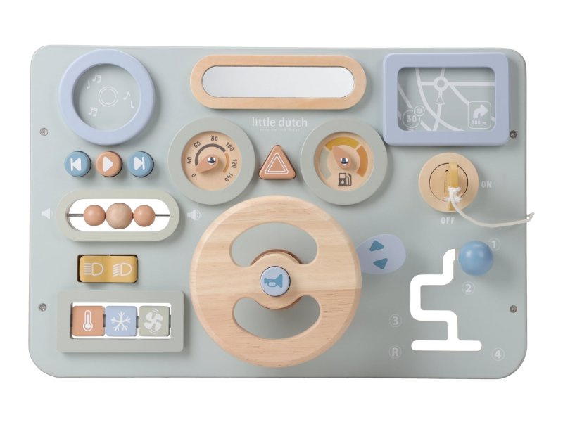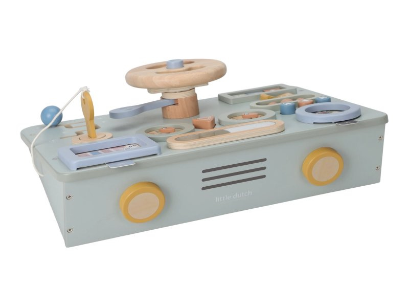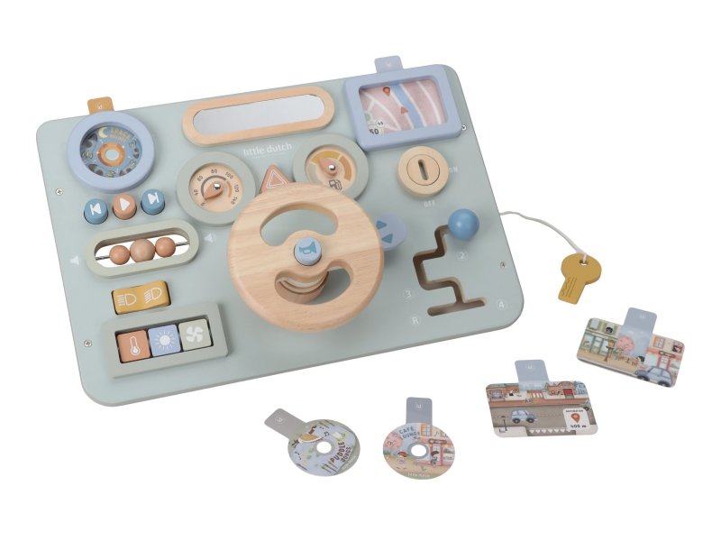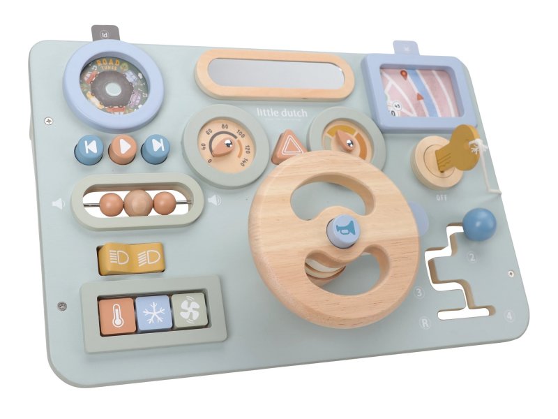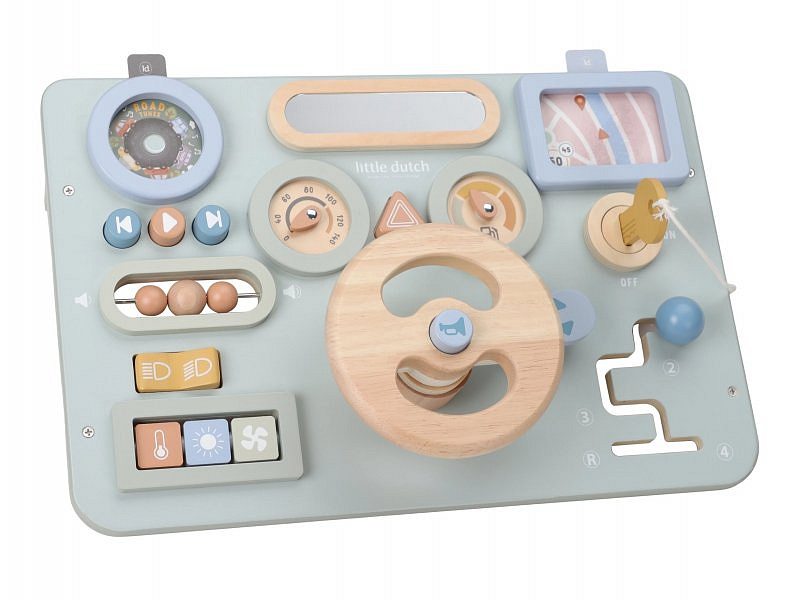 Dřevěný hrací pult s volantem láká děti na vlastní dobrodružnou jízdu. Dítě může otáčet volantem, mačkat tlačítka a objevovat veselé zvuky, které podporují aktivní a nápaditou hru. Součástí jsou také kartičky, díky kterým si dítě může „naplánovat trasu“ a vymýšlet vlastní příběhy. Pult je vyrobený z pevného dřeva v jemných pastelových barvách, takže se stane i krásným doplňkem dětského pokoje a dobře se kombinuje s dalšími dřevěnými hračkami. Hračka je součástí kolekce vysoce kvalitních dřevěných hraček Little Dutch, navržených s důrazem na bezpečnost a originální design. Vyrobeno z odolného FSC certifikovaného dřeva. Rozměry: 45 x 29 x 12,7 cm Vhodné pro děti od 12 měsíců.