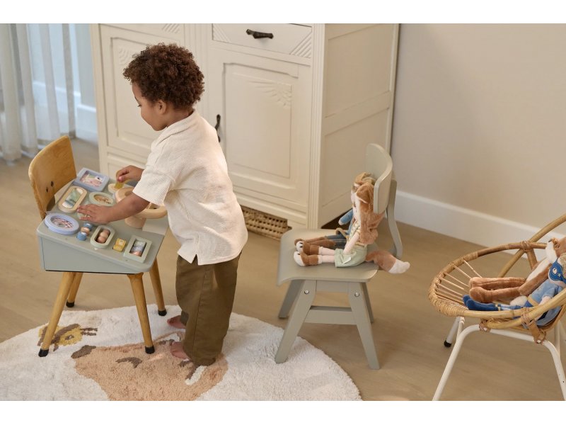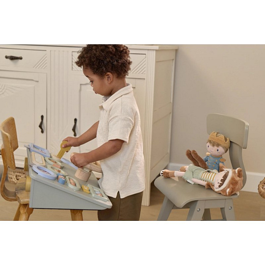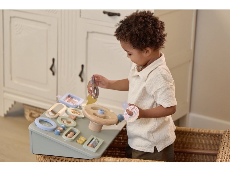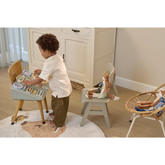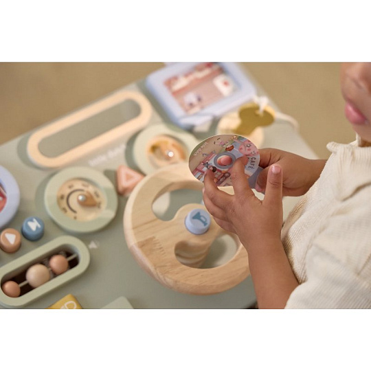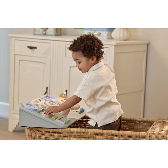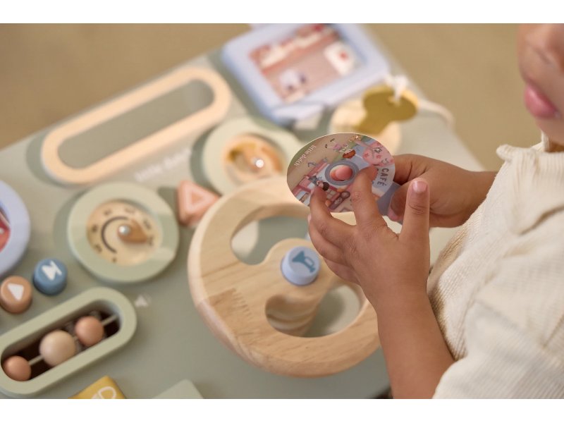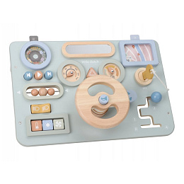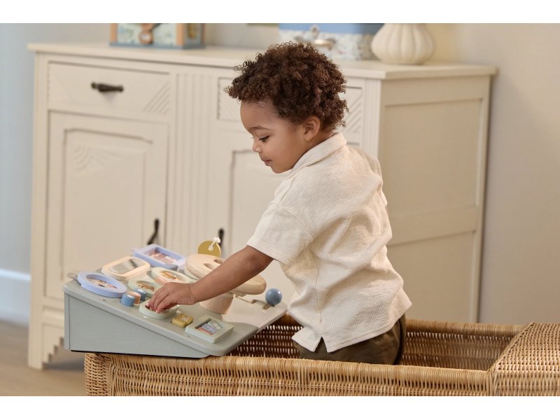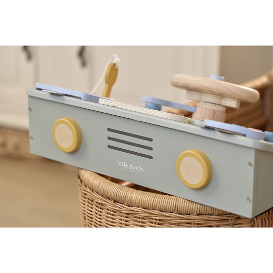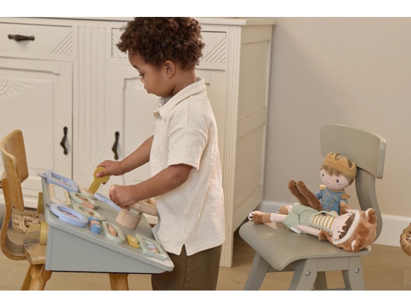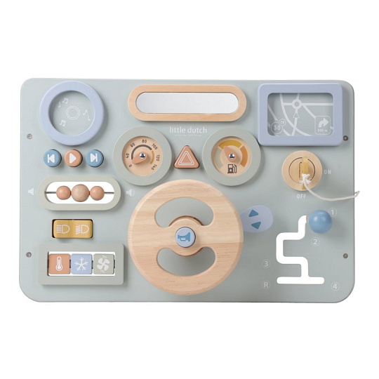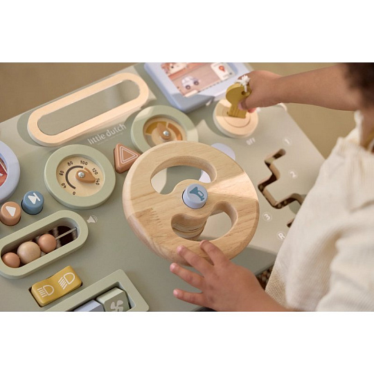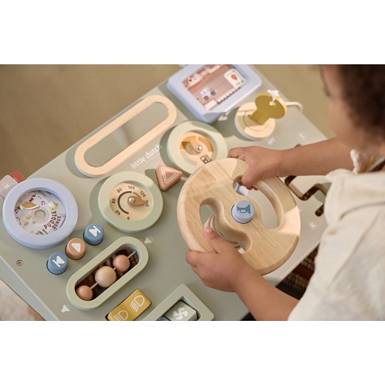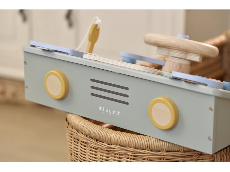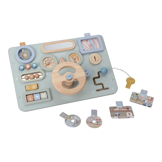 Dřevěný hrací pult s volantem láká děti na vlastní dobrodružnou jízdu. Dítě může otáčet volantem, mačkat tlačítka a objevovat veselé zvuky, které podporují aktivní a nápaditou hru. Součástí jsou také kartičky, díky kterým si dítě může „naplánovat trasu“ a vymýšlet vlastní příběhy. Pult je vyrobený z pevného dřeva v jemných pastelových barvách, takže se stane i krásným doplňkem dětského pokoje a dobře se kombinuje s dalšími dřevěnými hračkami. Hračka je součástí kolekce vysoce kvalitních dřevěných hraček Little Dutch, navržených s důrazem na bezpečnost a originální design. Vyrobeno z odolného FSC certifikovaného dřeva. Rozměry: 45 x 29 x 12,7 cm Vhodné pro děti od 12 měsíců.