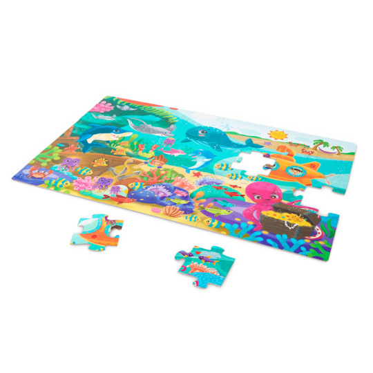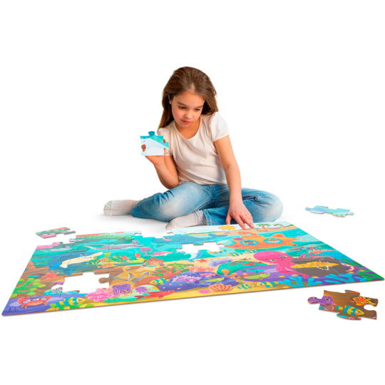 Připravte se na cestu do světa pod mořskou hladinou s maxi puzzle s krásnými ilustracemi mořského dna a jeho usměvavých obyvatel! Extra velké díly z pevného kartonu tvoří plochu 91,4 x 60,9 cm a jsou tak ideální pro skládání na podlaze. Skládání puzzle pomáhá rozvíjet jemnou motoriku i koordinaci rukou a očí dítěte. Dítě se zároveň učí trpělivosti a způsobu řešení problémů. Počet dílů: 48 ks Rozměry: 91,4 x 60,9 cm Vhodné pro děti od 3 let.