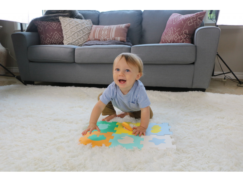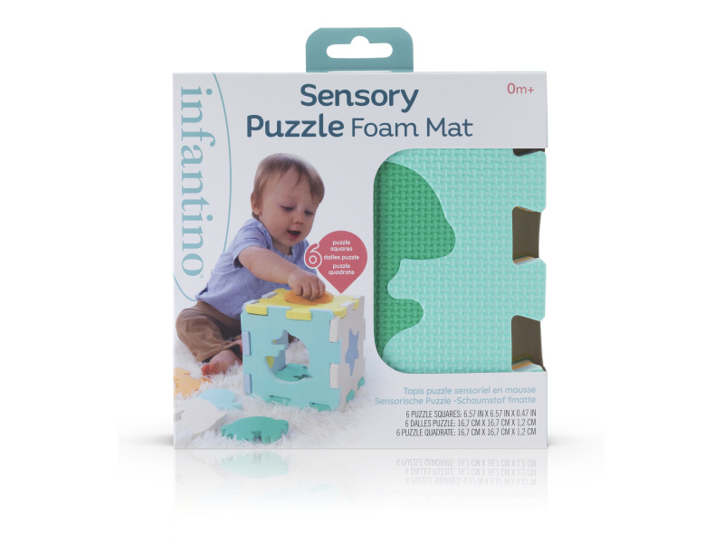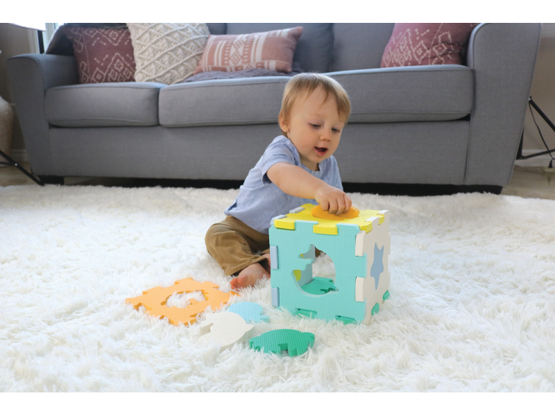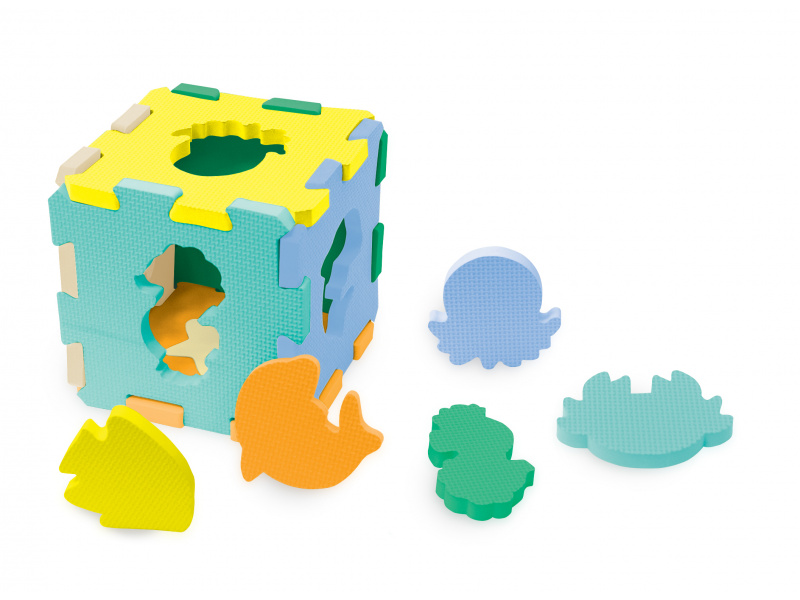 Extra silné pěnové puzzle vytváří bezpečné a měkké místo pro hraní dětí. Každý ze šesti dílů má jinou barvu a obsahuje vložený tvar nebo zvířátko. Z jednotlivých dílů můžete sestavit hrací podložku nebo z nich vytvořit kostku. Jednotlivé díly se snadno spojují a lze je jednoduše stohovat a ukládat. Hraní s puzzlemi pomáhá rozvíjet motorické dovednosti i jednotlivé smysly dítěte. Rozměry podložky: 50 x 33 cm Rozměry kostky: 16,7 x 16,7 x 16,7 cm Vhodné pro děti od narození.