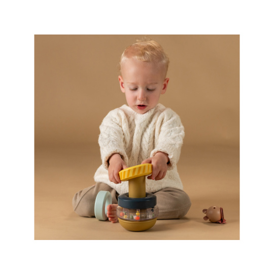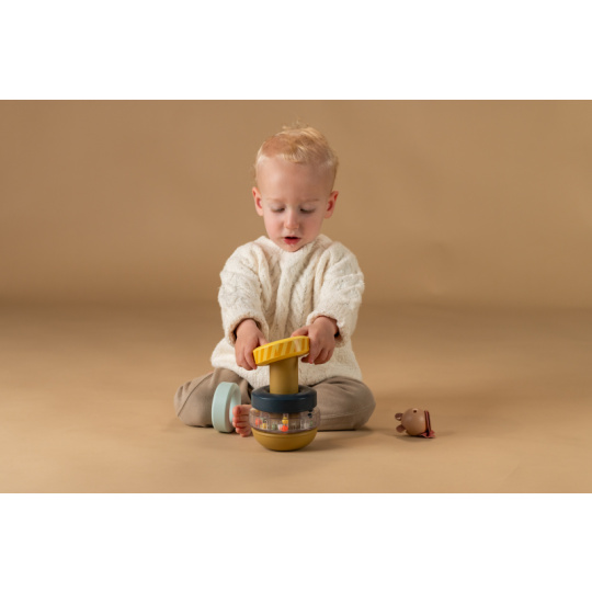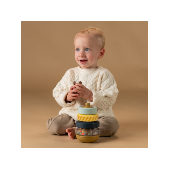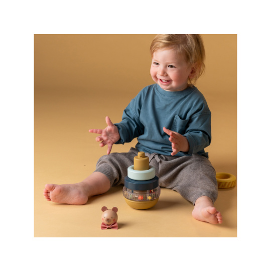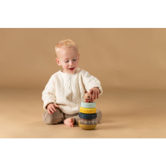 Barevná pyramida s roztomilou medvědí hlavičkou je zábavná a smyslově podnětná hračka, která podporuje jemnou motoriku, koordinaci a první logické uvažování dítěte. Podnětné hraní pro všechny smysly: Obsahuje čtyři kroužky – dva plné, jeden se vzorem a jeden průhledný s chrastícími kuličkami Děti si při hraní osahají různé textury a tvary, uvidí kontrasty a zaslechnou zvuky – to vše stimuluje zrak, sluch i hmat Každý kroužek lze postavit na bok a kutálet po zemi, čímž podporuje lezení a pohyb Podpora vývoje dovedností: Stohování kroužků zlepšuje koordinaci oko–ruka a jemnou motoriku Děti si při skládání trénují řešení problémů a prostorové vnímání Hračka je ideální pro učení barev, velikostí a pořadí Vhodné pro děti od 9 měsíců.