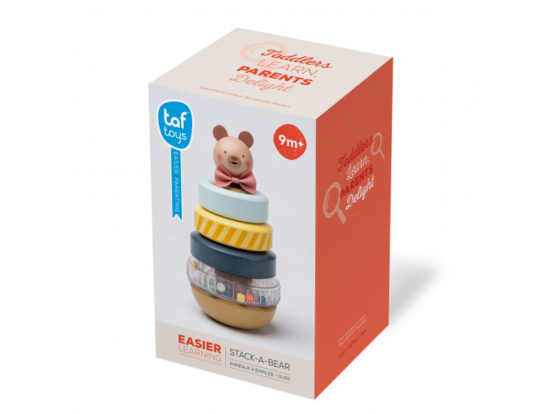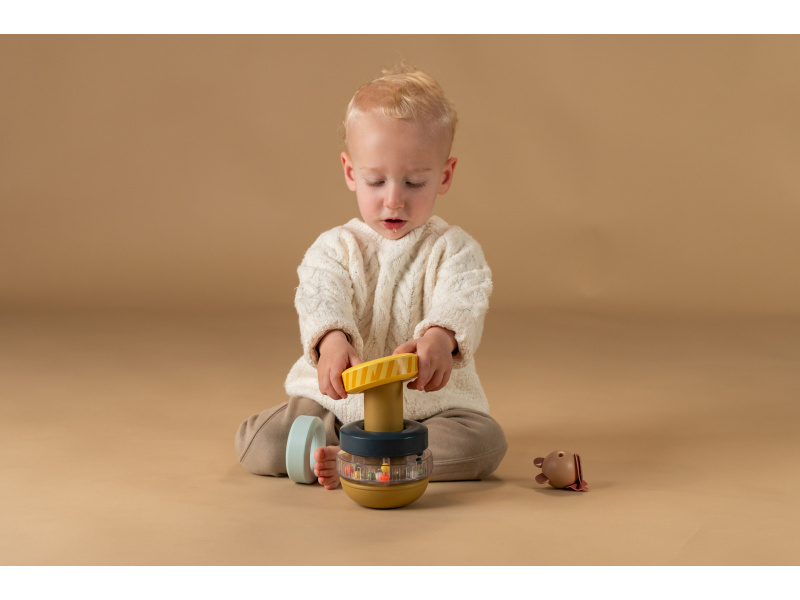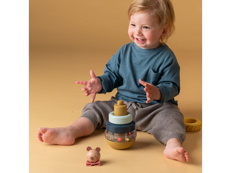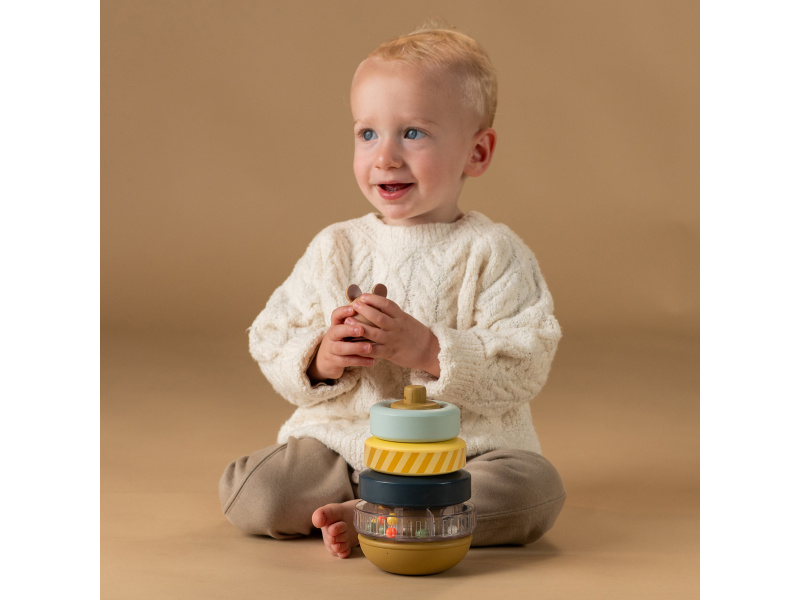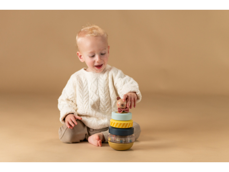 Barevná pyramida s roztomilou medvědí hlavičkou je zábavná a smyslově podnětná hračka, která podporuje jemnou motoriku, koordinaci a první logické uvažování dítěte. Podnětné hraní pro všechny smysly: Obsahuje čtyři kroužky – dva plné, jeden se vzorem a jeden průhledný s chrastícími kuličkami Děti si při hraní osahají různé textury a tvary, uvidí kontrasty a zaslechnou zvuky – to vše stimuluje zrak, sluch i hmat Každý kroužek lze postavit na bok a kutálet po zemi, čímž podporuje lezení a pohyb Podpora vývoje dovedností: Stohování kroužků zlepšuje koordinaci oko–ruka a jemnou motoriku Děti si při skládání trénují řešení problémů a prostorové vnímání Hračka je ideální pro učení barev, velikostí a pořadí Vhodné pro děti od 9 měsíců.
