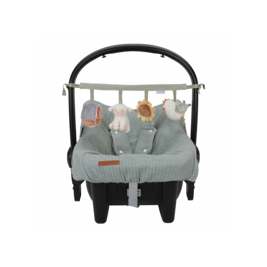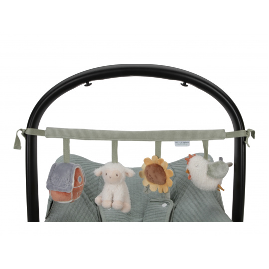 Čtyři zavěšené plyšové hračky v podobě slepičky, ovečky, slunečnice a domečku zabaví vaše miminko na cestách v autosedačce či kočárku. Jednotlivé hračky při zkoumání dětskými ručičkami chrastí, po zmáčknutí pískají a šustí. Hračky stimulují koordinaci ruka / oko dítěte. Hračka je součástí designové kolekce hraček Little Dutch Farma. Rozměry: 35 x 14 x 8 cm Vhodné pro děti od narození.