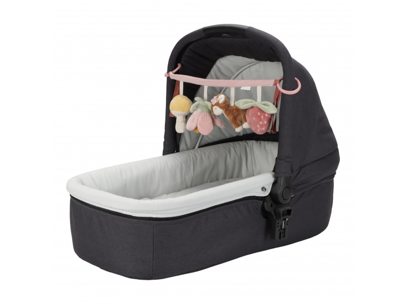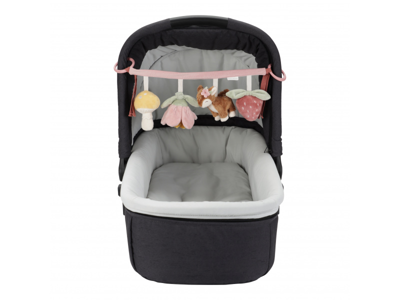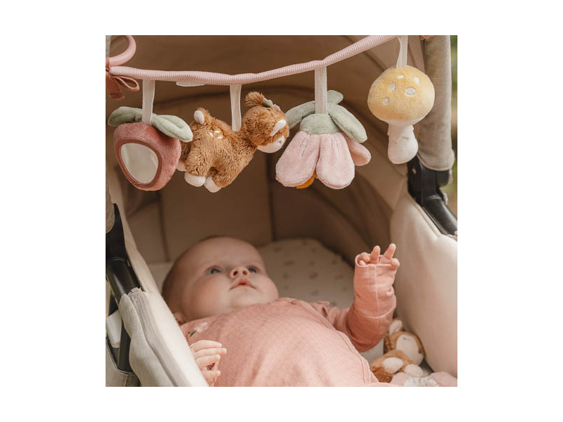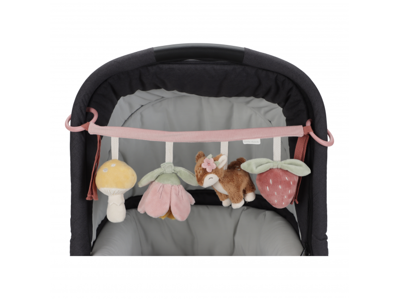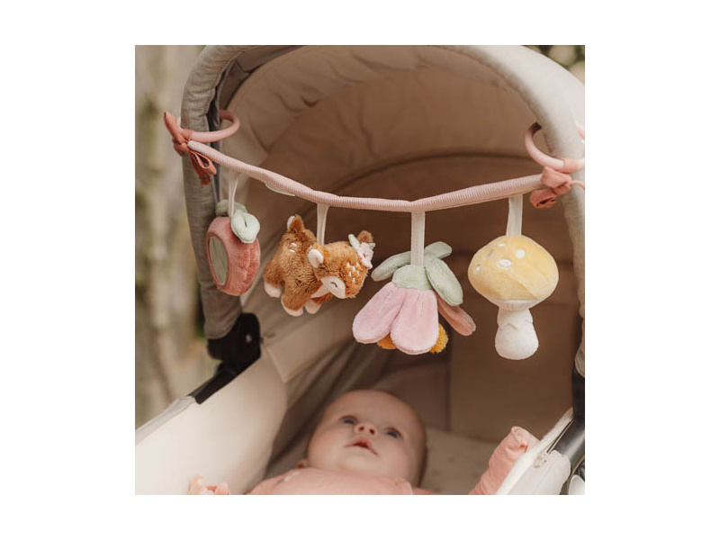 Čtyři zavěšené plyšové hračky v podobě srnky, květiny, houbičky a jahody zabaví vaše miminko na cestách v autosedačce či kočárku. Jednotlivé hračky při zkoumání dětskými ručičkami chrastí, po zmáčknutí pískají a šustí. Hračky stimulují koordinaci ruka / oko dítěte. Hračka je součástí designové kolekce hraček Little Dutch Fairy Garden inspirované životem na zahradě. Rozměry: 35 x 14 x 8 cm Vhodné pro děti od narození.