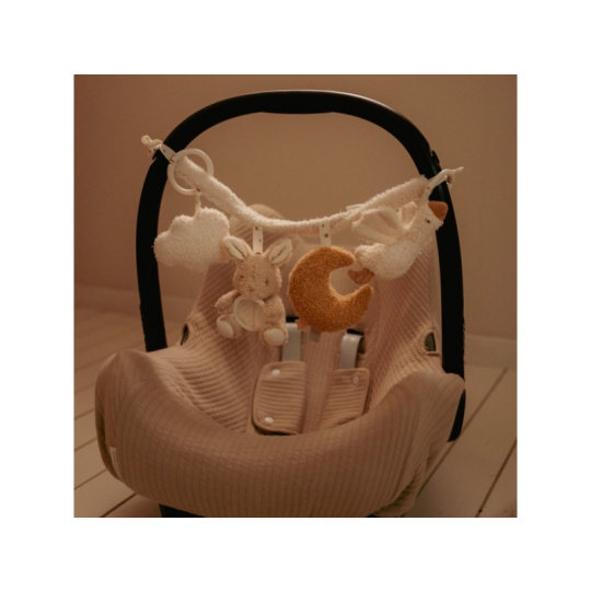 Roztomilý textilní řetěz se zavěšeným plyšovými hračkami se postará o radost a pozornost vašeho miminka během každé jízdy v kočárku i autosedačce. Hračka je navržena tak, aby byla příjemná na dotek, bezpečná a vizuálně klidná. Hravý společník na cesty: Měkké plyšové hračky zaujmou dítě pohybem i zvukem Jemné chrastění podporuje sluchové vnímání a uklidňuje Snadné připevnění na kočárek pomocí pružných kroužků Tlumené, přírodní barvy stimulují, ale nepřetěžují dětský zrak Hračka je součástí designové kolekce hraček Little Dutch Newborn Naturals. Délka: cca 36 cm Složení: 100% polyester Výplň je vyrobena ze 100% recyklovaného polyesteru s certifikací GRS (Global Recycled Standard). Možno prát v pračce na jemný program při 30°C. Vhodné pro děti od narození.
