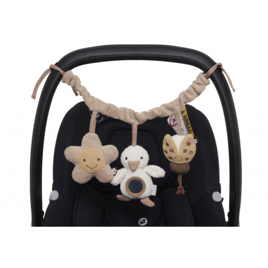 Řetěz na kočárek či autosedačku zabaví vaše dítě na procházkách i cestách autem. Tři zavěšené hračky v podobě plyšové kytičky, ptáčka a berušky při zmáčknutí šustí, beruška jemně cinká, pozornost dítěte upoutá i bezpečné zrcátko na bříšku ptáčka. Řetěz s hračkami snadno připevníte ke kočárku i autosedačce díky vázacím šňůrkám. Vhodné pro děti od narození.