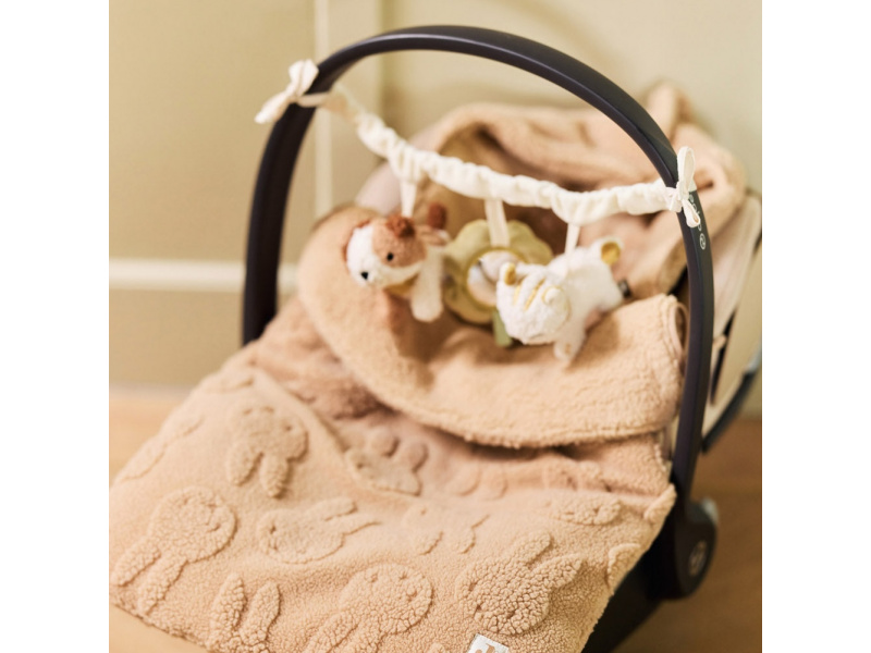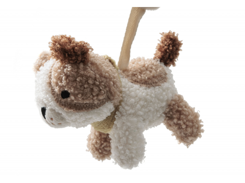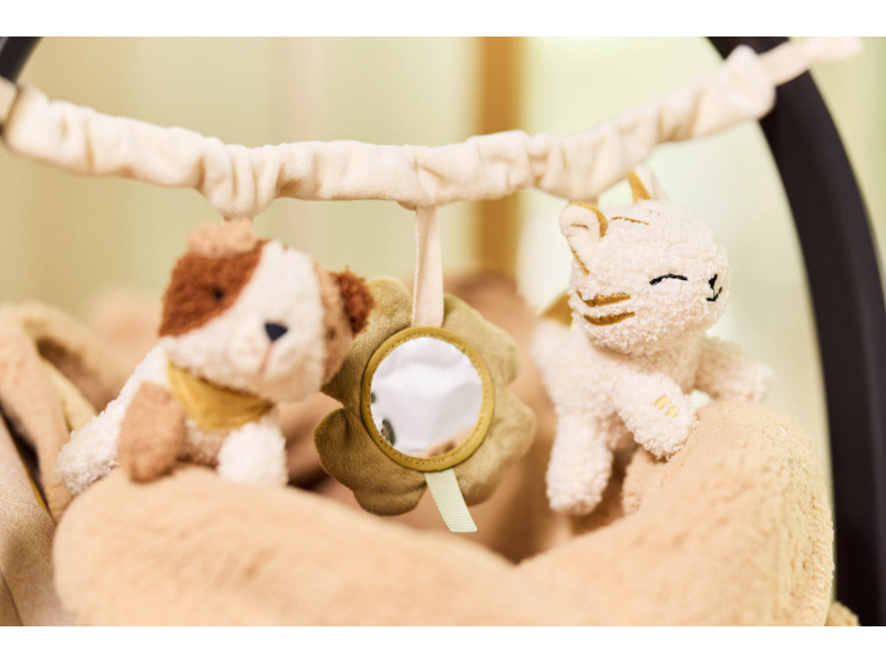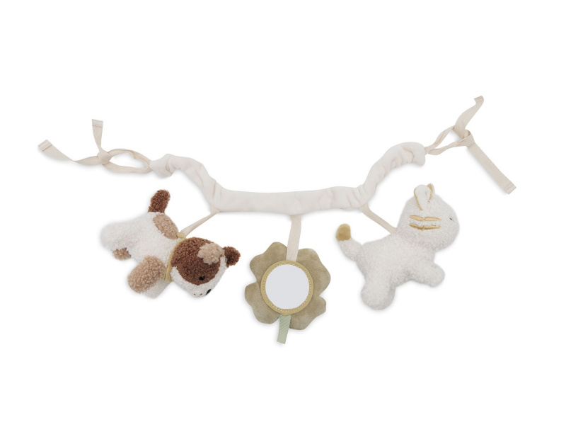 Řetěz na kočárek či autosedačku se zavěšenými hračkami v podobě pejska, kočičky a čtyřlístku s bezpečným zrcátkem zabaví vaše miminko v kočárku či autosedačce. Měkké hračky vyrobené z jemného plyše cinkají a nabízí různé textury pro zkoumání. Hračky stimulují koordinaci ruka / oko dítěte. Řetěz s hračkami snadno připevníte ke kočárku i autosedačce díky vázacím šňůrkám. Složení: polyester, bavlna Možno prát v ruce. Vhodné pro děti od narození.