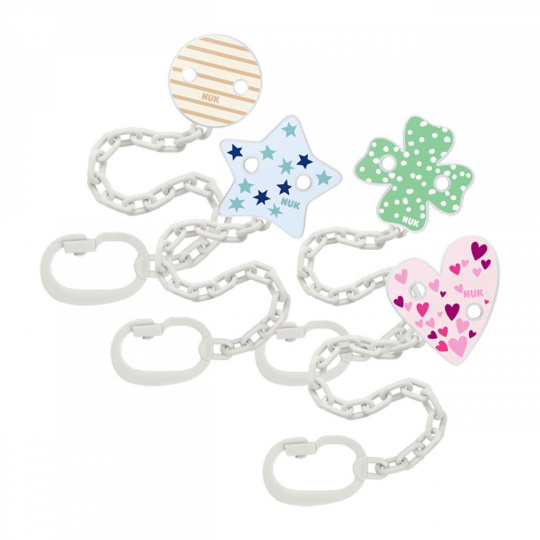 Veselý, barevný řetízek na dudlík NUK, je skvělým pomocníkem pro miminka i rodiče. Nenahraditelný zvláště během cestování a procházek. Díky sponě dudlík nespadne na zem a nezašpiní se, a neztratí se. Má jednoduché použití a je vyroben tak, aby se dal připnout k dětskému oblečení. Pestré barvy a veselé obrázky dítě zaujmou. Určeno pro děti od prvních dnů života.