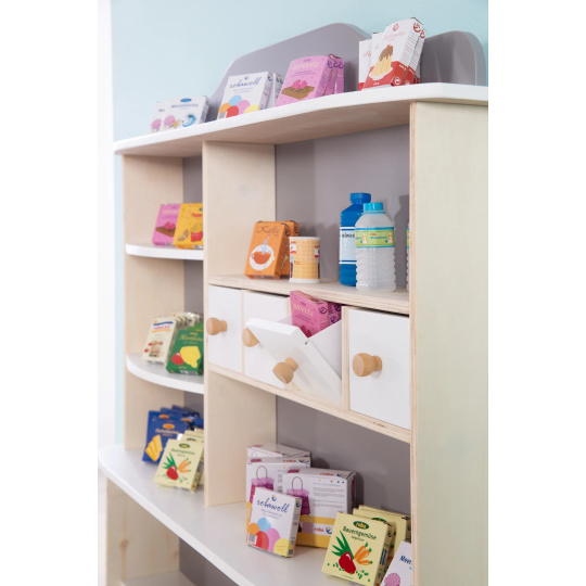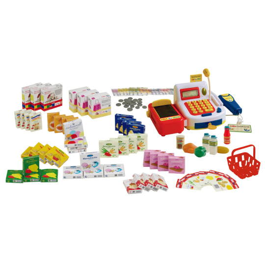 Hrací peníze, karty EC, láskyplně navržené obaly produktů, cedulky s nabídkou, nákupní košík, ovoce a plastové lahve doplňují sadu. K dispozici je příslušenství, které se hodí k různým verzím prodejních stojanů roba.