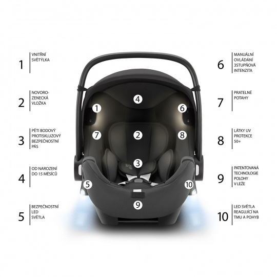 Pak je tady další dvojice světýlek, která má jinou funkci. Teplá, tlumená světýlka uvnitř sedačky vám zajistí, že vždy budete vidět, co vaše miminko zrovna dělá. Světýlka vám v šeru auta pomohou i se snadnějším připoutáním dítěte. Mají nastavitelný automat, kdy se světýlka rozsvítí, vy dítě do sedačky připoutáte a světla po minutě sama zhasnou.