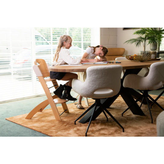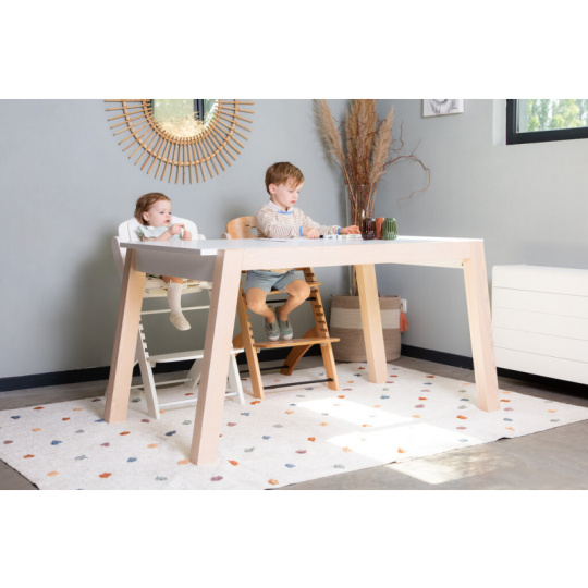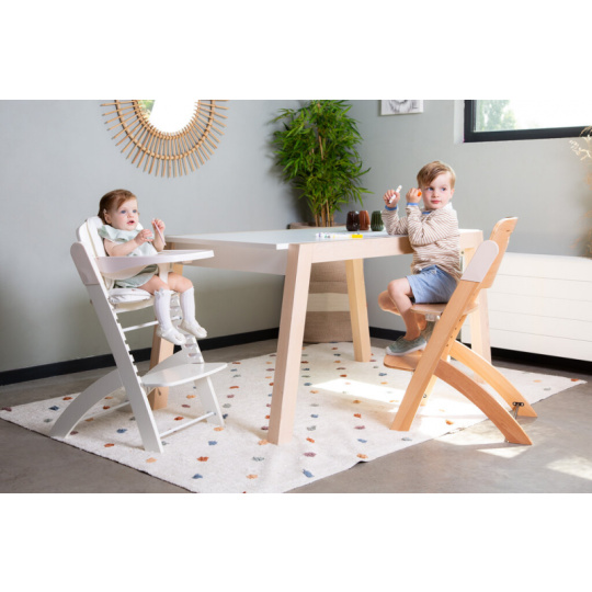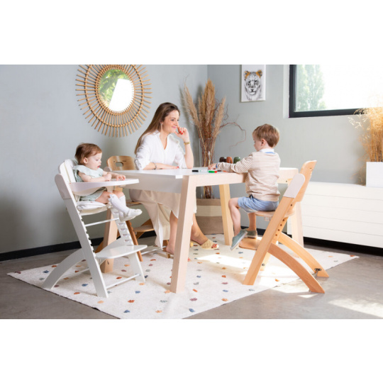 Rostoucí židlička z bukového dřeva Childhome Evosit umožňuje snadné nastavení výšky sedáku a opěrky nohou bez šroubování. Díky svému nadčasovému designu se židlička stane i krásným doplňkem vašeho interiéru. Odnímatelný jídelní pult z ABS plastu se snadno udržuje otřením a je možné jej mýt myčce. Bezpečné usazení dítěte zajišťuje 5-bodový bezpečnostní pás a madlo kolem pasu. Pro starší děti je možné madlo i pásy odmontovat a židličku používat jako standardní židli ke stolu. Díky nosnosti do 85 kg je možné židličku používat až do dospělosti dítěte. Pro větší pohodlí dítěte je možné k židličce dokoupit sedací polštářky. Rozměry jídelního pultu: Š 36 cm - H 17 cm Výška pultu od země: 72,5 cm Rozměry sedáku: Š 43 cm - H 23 cm Možné výšky sedáku: 56 cm - 52,5 cm - 49 cm Rozměry opěrky nohou: Š 43cm - H 26cm Možné výšky opěrky nohou: 41, 37, 33.5, 29.5 a 26 cm Půdorys židličky: 45 x 60 cm Rozměry: 45 x 53 x 86 cm Nosnost: 85 kg Vhodné pro děti od 6 měsíců.