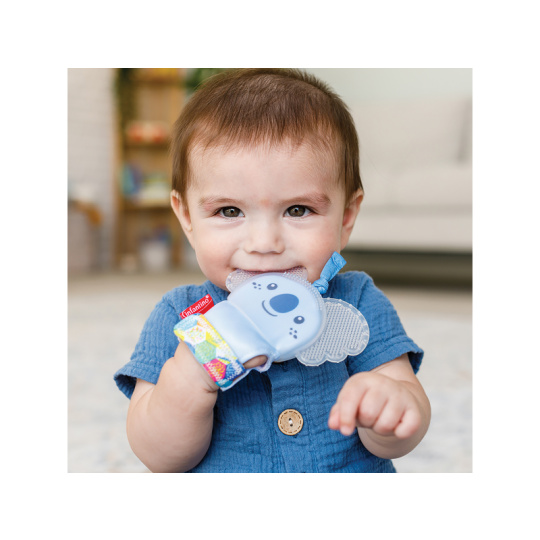 Rukavička se zapínáním na suchý zip je vyrobena z měkkého a jemného materiálu. Součástí rukavičky je silikonové kousátko v podobě medvídka koaly. Jemný silikon s různými texturami pomáhá přinášet úlevu citlivým dásním vašeho dítěte při prořezávání prvních zoubků. Pro čištění je možné kousátko z rukavičky sejmout. Rozměry: 11,5 x 10,5 cm Vhodné pro děti od narození.