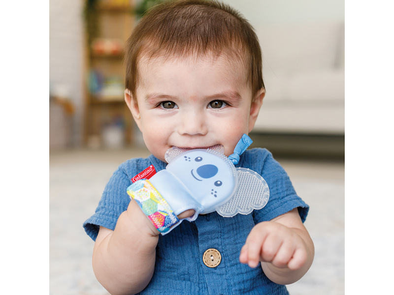 Rukavička se zapínáním na suchý zip je vyrobena z měkkého a jemného materiálu. Součástí rukavičky je silikonové kousátko v podobě medvídka koaly. Jemný silikon s různými texturami pomáhá přinášet úlevu citlivým dásním vašeho dítěte při prořezávání prvních zoubků. Pro čištění je možné kousátko z rukavičky sejmout. Rozměry: 11,5 x 10,5 cm Vhodné pro děti od narození.