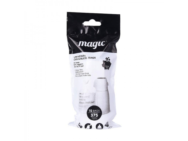 Univerzální sáčky do košů na pleny Magic. 3-vrstvý extra silný materiál brání protékání a chrání před šířením zápachu. Balení obsahuje 15 ks sáčků, vystačí přibližně pro 375 ks plen pro novorozence (počet plen záleží na jejich velikosti). Vyrobeno z recyklovaného materiálu.