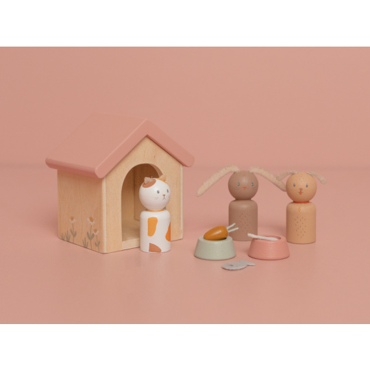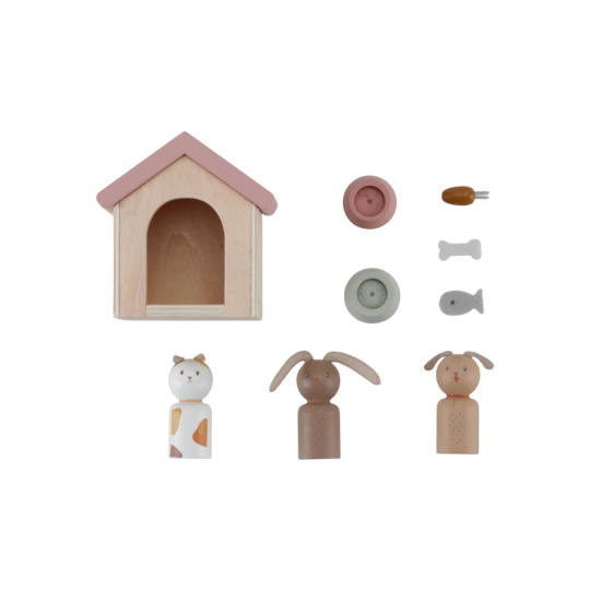 Sada s domácími mazlíčky v krásném dřevěném provedení je vhodný doplněk k dřevěnému domečku pro panenky Little Dutch. Sada obsahuje pejska, kočičku, králíčka, psí boudu, dvě misky, mrkvičku, rybu a kost. Vhodné pro děti od 3 let.