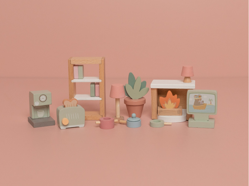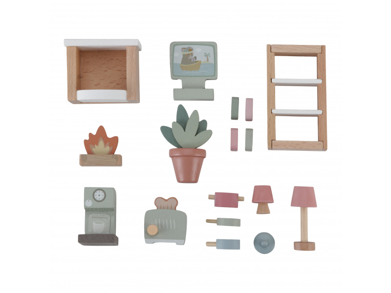 Sada doplňků do obývacího pokoje a kuchyně v krásném dřevěném provedení vhodně doplňuje vybavení dřevěného domečku pro panenky Little Dutch. Sada obsahuje knihovnu, lampičku, květinu v květináči, lampu, televizi, krb, kávovar, toastovač a sadu hrnců. Vhodné pro děti od 3 let.