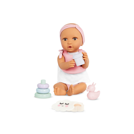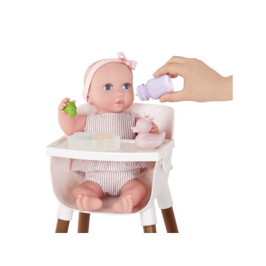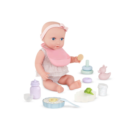 S touto sadou doplňků pro panenku se děti mohou postarat o nakrmení i přebalení své panenky jako opravdoví rodiče. Sada obsahuje bryndáček, misku s jídlem (ovesná kaše, brokolice a sušenka), lahvičku s mlékem, hrnek, lžičku, 2 kroužky, kousátko, kachničku, přebalovací plenku, zásobník ubrousků a praktický úložný box ve tvaru obláčku. Děti si mohou vyzkoušet péči o miminko, rozvíjet přitom jemnou motoriku, představivost i sociální dovednosti. Vhodné pro většinu panenek velikosti 35 cm. Panenka není součástí balení. Vhodné pro děti od 2 let.