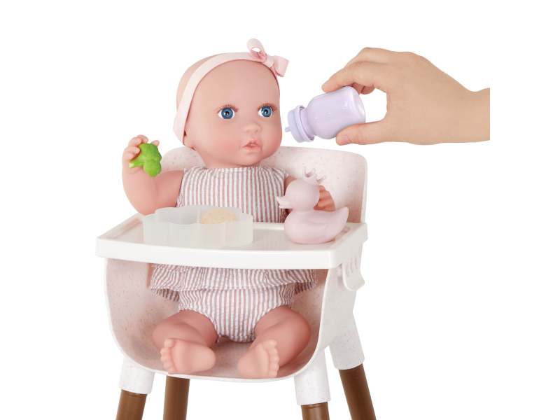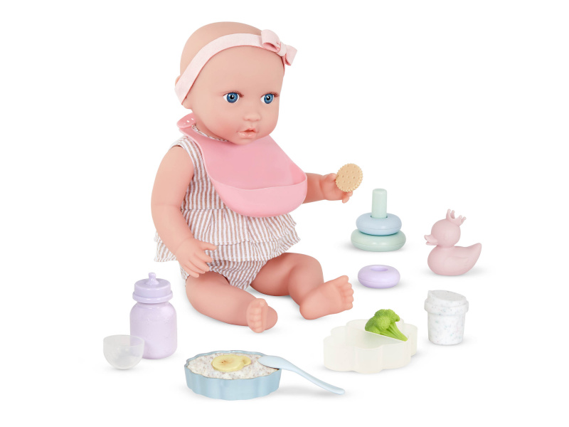 S touto sadou doplňků pro panenku se děti mohou postarat o nakrmení i přebalení své panenky jako opravdoví rodiče. Sada obsahuje bryndáček, misku s jídlem (ovesná kaše, brokolice a sušenka), lahvičku s mlékem, hrnek, lžičku, 2 kroužky, kousátko, kachničku, přebalovací plenku, zásobník ubrousků a praktický úložný box ve tvaru obláčku. Děti si mohou vyzkoušet péči o miminko, rozvíjet přitom jemnou motoriku, představivost i sociální dovednosti. Vhodné pro většinu panenek velikosti 35 cm. Panenka není součástí balení. Vhodné pro děti od 2 let.