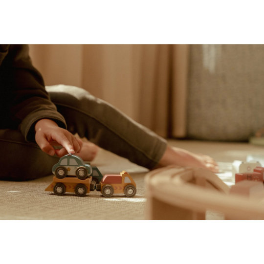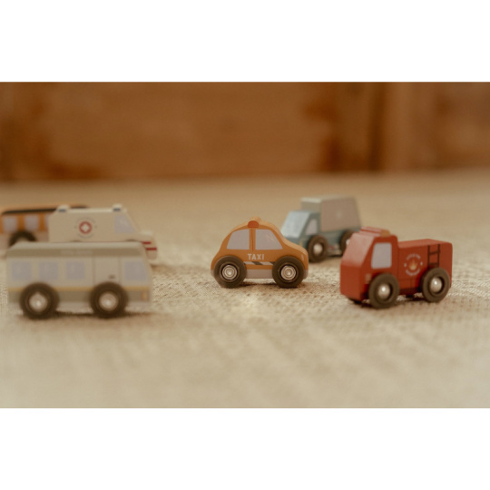 Město je pořád v pohybu! Tato sada dřevěných vozidel různých profesí je připravena vyrazit do akce a pomáhat tam, kde je třeba. Hasičské auto vyjíždí k požáru, policejní vůz hlídkuje po městě a nákladní auto dováží zásoby – každý den přináší nové dobrodružství. Autíčka jsou kompatibilní s vláčkodráhou Little Dutch a jejími rozšiřujícími sadami. Děti si tak mohou vytvořit vlastní město plné akce, příběhů a pohybu. Hra podporuje představivost, jemnou motoriku a samostatné vyprávění. Hračka je součástí kolekce vysoce kvalitních dřevěných hraček Little Dutch, navržených s důrazem na bezpečnost a originální design. Vyrobeno z odolného FSC certifikovaného dřeva. Sada obsahuje 10 vozidel. Vhodné pro děti od 2 let.