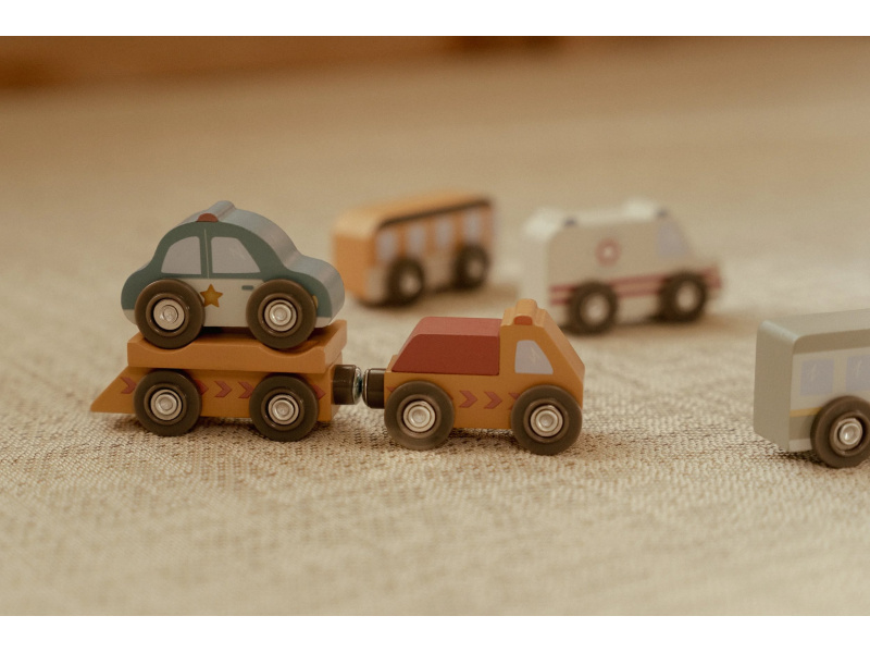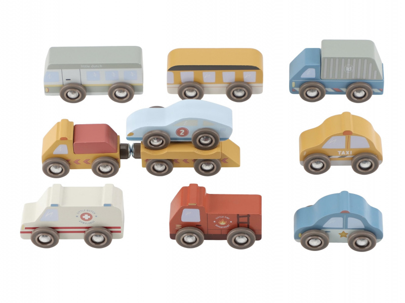 Město je pořád v pohybu! Tato sada dřevěných vozidel různých profesí je připravena vyrazit do akce a pomáhat tam, kde je třeba. Hasičské auto vyjíždí k požáru, policejní vůz hlídkuje po městě a nákladní auto dováží zásoby – každý den přináší nové dobrodružství. Autíčka jsou kompatibilní s vláčkodráhou Little Dutch a jejími rozšiřujícími sadami. Děti si tak mohou vytvořit vlastní město plné akce, příběhů a pohybu. Hra podporuje představivost, jemnou motoriku a samostatné vyprávění. Hračka je součástí kolekce vysoce kvalitních dřevěných hraček Little Dutch, navržených s důrazem na bezpečnost a originální design. Vyrobeno z odolného FSC certifikovaného dřeva. Sada obsahuje 10 vozidel. Vhodné pro děti od 2 let.