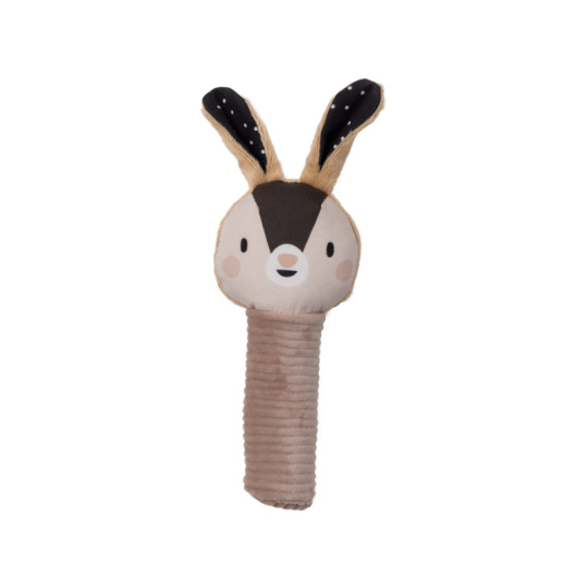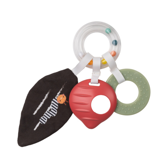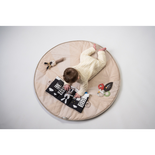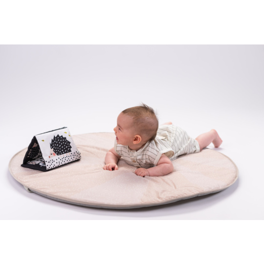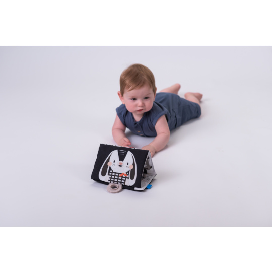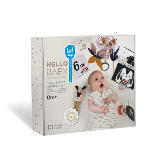 Dárkový box obsahuje 10 vývojových hraček navržených k posílení smyslového, motorického a kognitivního rozvoje vašeho dítěte od prvních dnů života: Knížka na bříško: Černobílá šustivá knížka pro stimulaci smyslů je ideální pro čas hry na bříšku, podporuje zrakový a sluchový vývoj. Motýlí zvonkohra: Kolotoč se zvonkem a motýlky v kontrastních barvách nabízí vizuální stimulaci a jemné zvukové podněty, čímž podporuje emoční rozvoj a učení o příčině a následku. Chrastítko a kousátko: Kroužkové chrastítko s kousátky a šustivým listem pomáhá rozvíjet jemnou motoriku a koordinaci rukou. Pískací králíček: Pískací hračka s hlavou králíčka a šustivými oušky poskytuje další smyslové podněty a přispívá k porozumění příčině a následku. Milníkové kartičky: Oboustranné kartičky s měsíčními milníky jsou ideální pro dokumentování a sdílení těch nejroztomilejších okamžiků vašeho miminka. Každý prvek této sady lze používat samostatně, což umožňuje přizpůsobit aktivity potřebám vašeho dítěte a podpořit jeho optimální rozvoj. Knížka se dá připevnit na postýlku, kočárek nebo autosedačku pro zabavení dítěte na cestách, kolotoč můžete zavěsit na kočárek nebo hrazdu hrací deky. Rozměry boxu: 36 x 26 x 7 cm Vhodné pro děti od narození.